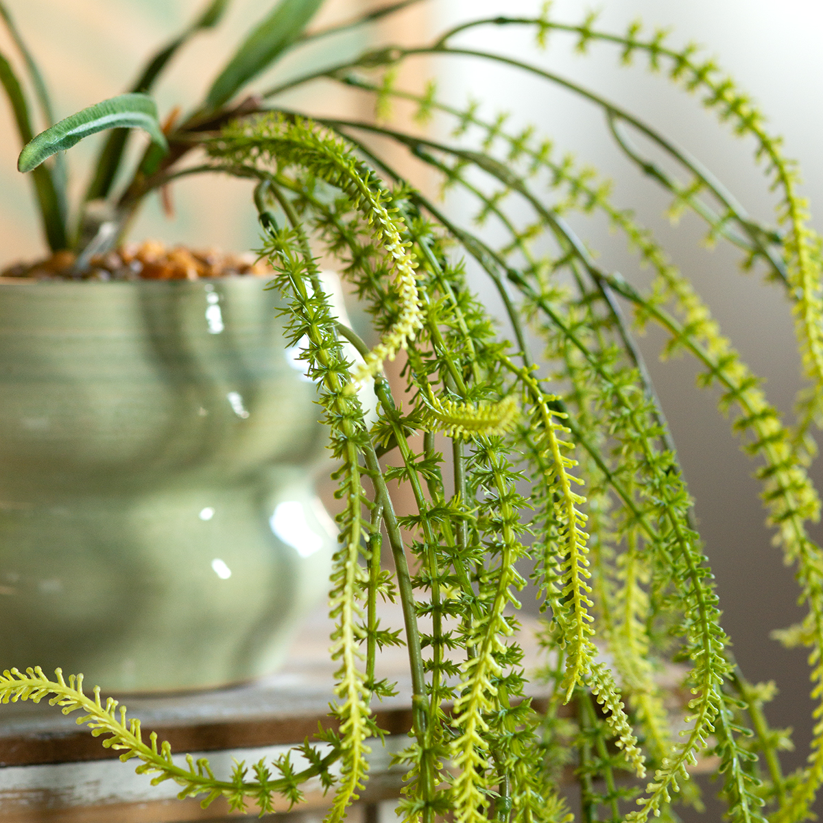 Of het nu in de woonkamer, op het terras of bij grote evenementen is – de veelzijdigheid ervan zal u zeker bevallen. Liefhebbers van de trendy urban jungle-stijl kunnen deze kunstmatige klimplant prachtig combineren met houten of rotan meubels. Het is ook een elegant decoratief element in cafés, winkels of hotels, waar het subtiele accenten toevoegt en elke ruimte net dat beetje extra geeft. Dankzij de eenvoudige groenachtige kleur is de vossenstaartgierst te combineren met zowel lichte als donkere tinten.