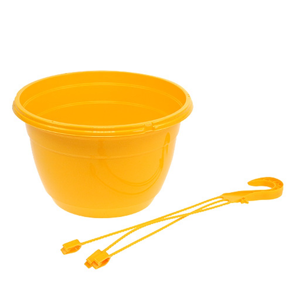 De gele hangmand van licht maar duurzaam kunststof heeft een buitendiameter van circa 25 centimeter, een binnendiameter van circa 23 centimeter en een bodemdiameter van circa 15 centimeter. De bloempot zelf is ongeveer 15,5 centimeter hoog en de totale lengte is ongeveer 50 centimeter. Let op: de hangmand wordt zonder schotel geleverd en is daarom alleen geschikt voor buitengebruik.