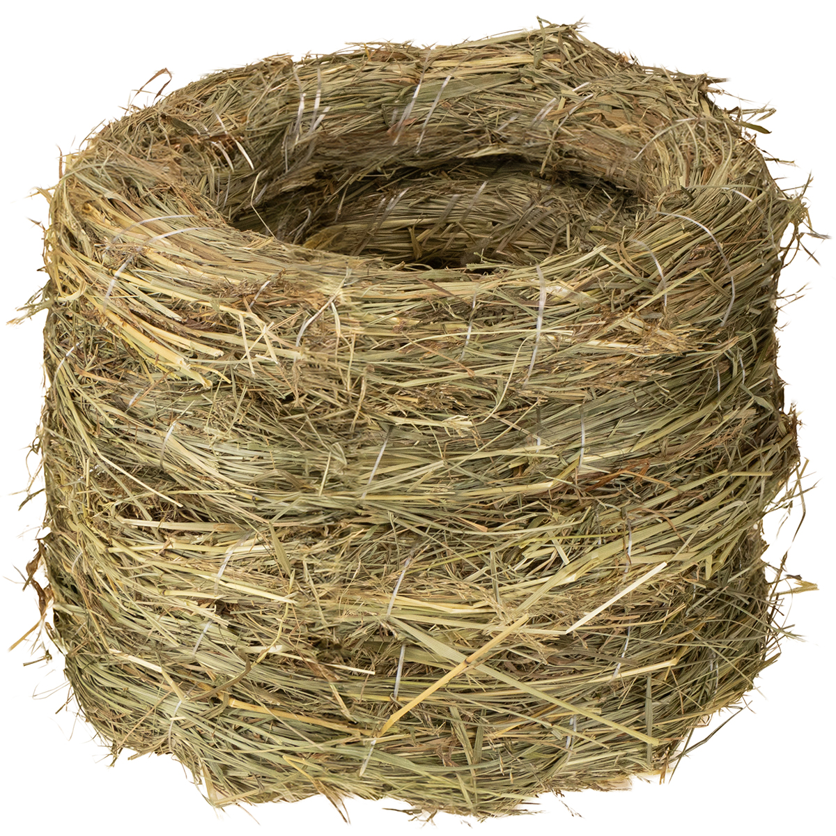 De hooikransen zijn samengebonden als pakket van in totaal 5 stuks en zijn allemaal met de hand gemaakt. Er werd hooi van hoge kwaliteit geselecteerd, dat vervolgens in een ring werd gerold en vervolgens met een nylonkoord in vorm werd gebonden. Daarom kunnen de afmetingen altijd iets afwijken; De kransen hebben een buitendiameter die ongeveer tussen de 26 en 27 centimeter ligt. De binnendiameter is ongeveer 19 centimeter en de hoogte is ongeveer 4 centimeter.