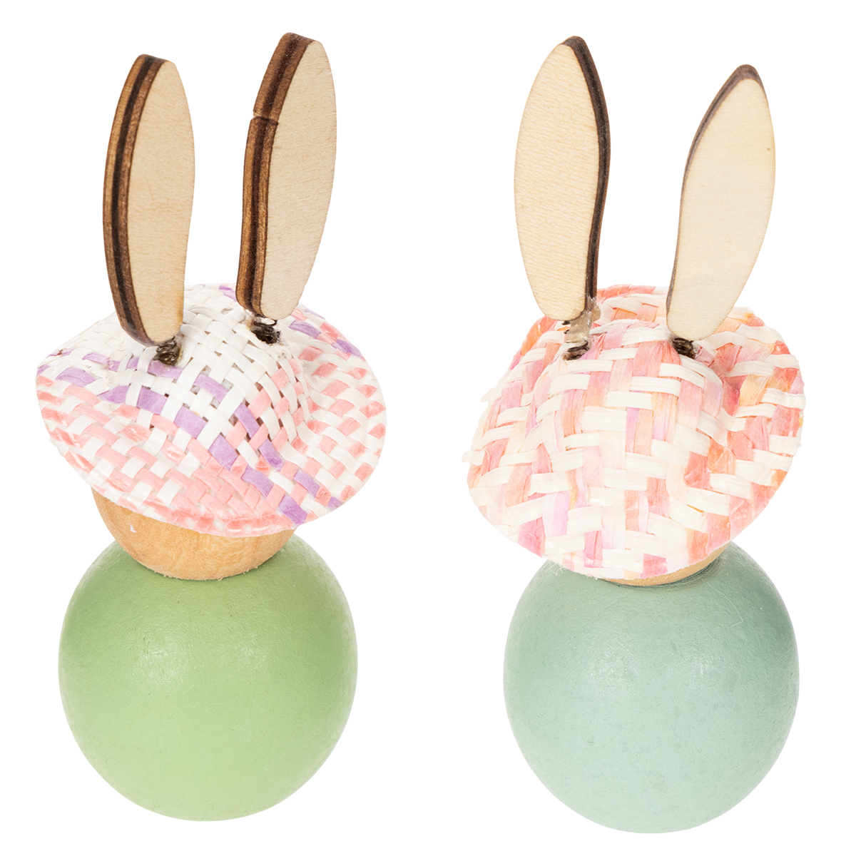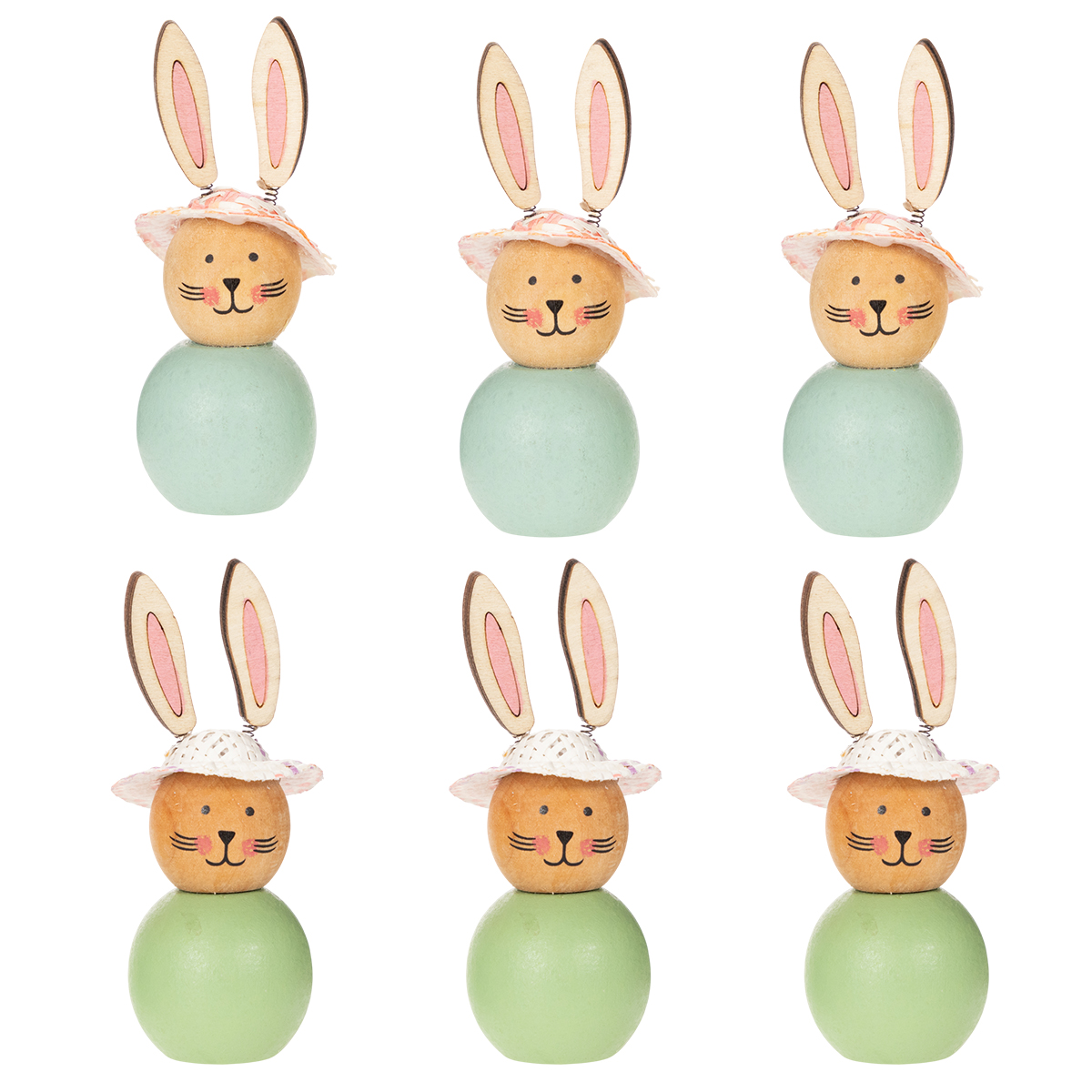 Deze houten beeldjes imponeren met hun natuurlijke charme en vrolijke uitstraling: helder hout gecombineerd met subtiele tinten groen en mintgroen ontmoet een speels ontwerp. Vooral de roze hoedjes geven de beeldjes een stijlvolle vintage touch. Elk konijntje is ongeveer 9 cm hoog en brengt een vleugje lente in huis. De oortjes op metalen veertjes zijn niet alleen een lust voor het oog, maar voegen ook een levendig detail toe dat zeker de aandacht zal trekken.
