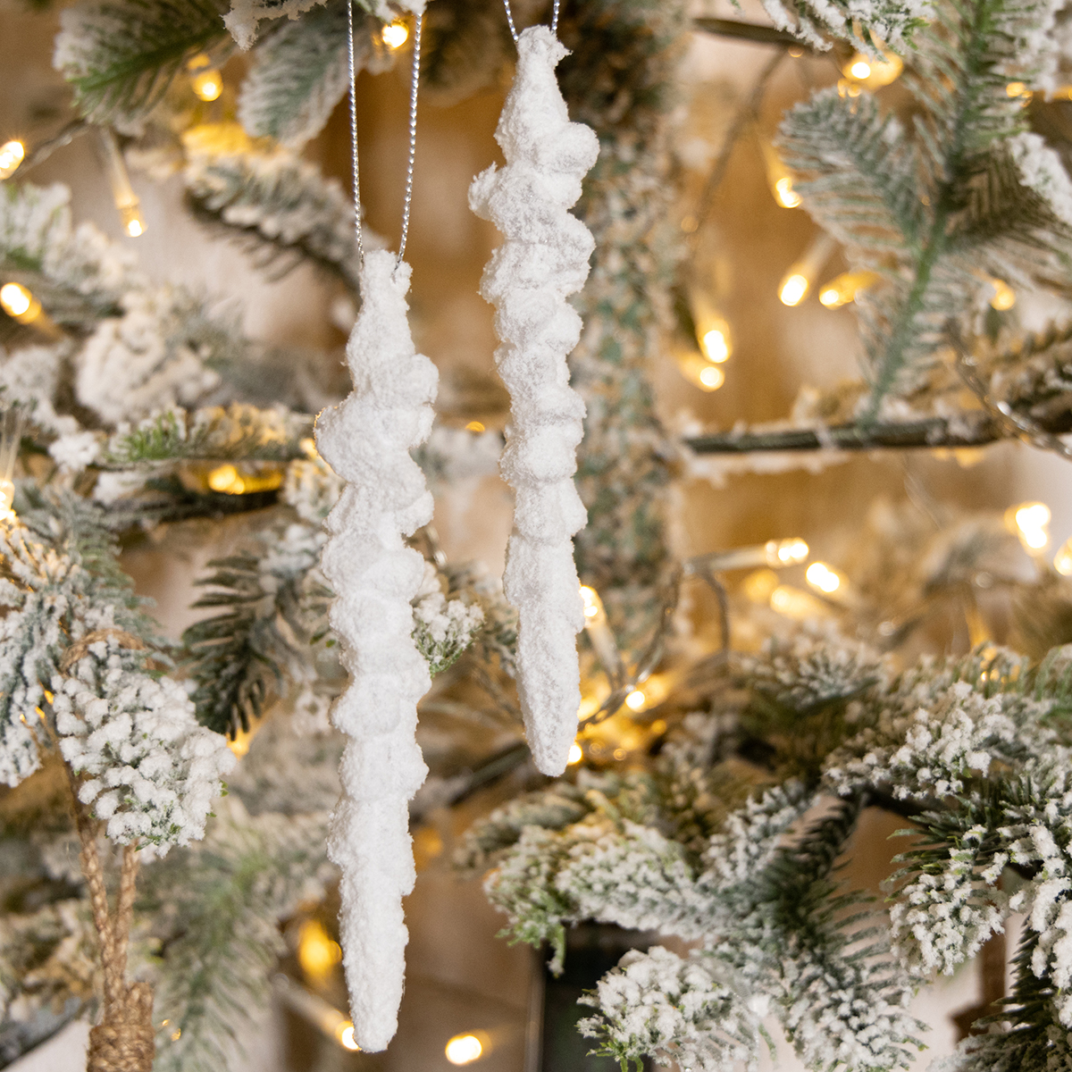 Besneeuwde kerstboomversieringen in de vorm van ijspegels – witte wintermagie voor de woonkamer