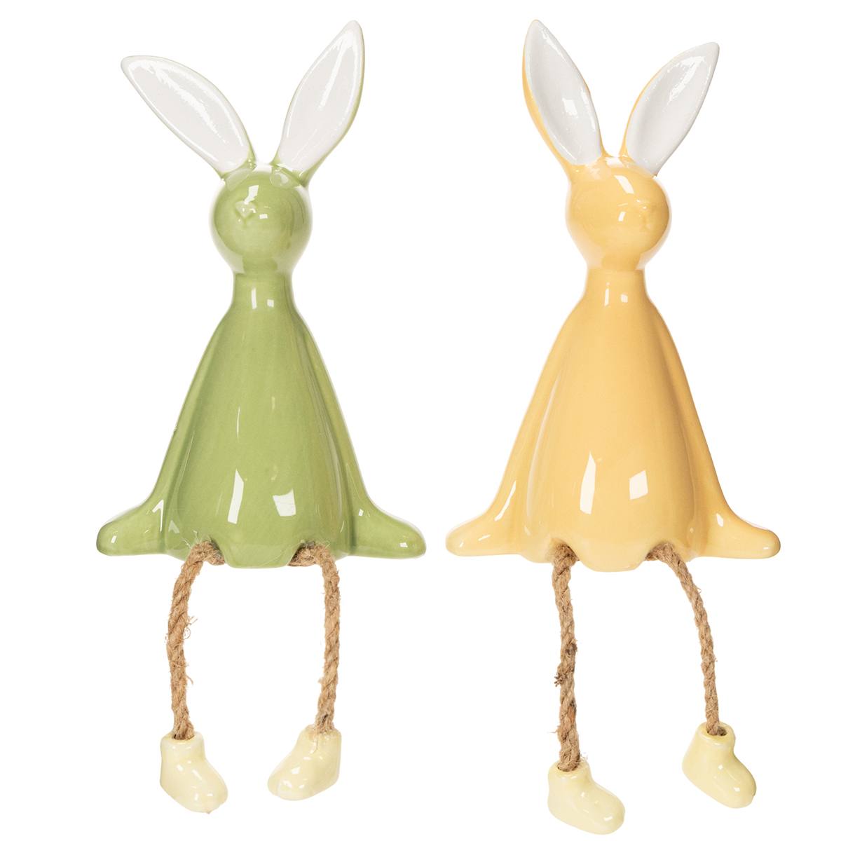 Op zoek naar lentedecoraties die iedereen blij maken? Deze charmante beeldjes zijn meer dan alleen paasdecoraties – ze brengen vrolijkheid rechtstreeks in je woonkamer, op de vensterbank of op de paastafel. Twee schattige keramische konijntjes van 22 cm hoog, een in frisgroen en de andere in zonnig geel, staan klaar om je lente op te fleuren. Hun bungelende pootjes en lange oren geven ze een charmante, speelse uitstraling die zowel kinderen als volwassenen zal bekoren. Of je nu op zoek bent naar nieuwe paasdecoraties voor het gezin of gewoon een speciaal accent wilt toevoegen aan je lentedecoratie, deze beeldjes zijn echte blikvangers. Stel je eens voor hoe de kleine keramische konijntjes op je vensterbank staan of voor gespreksstof zorgen aan de eettafel.