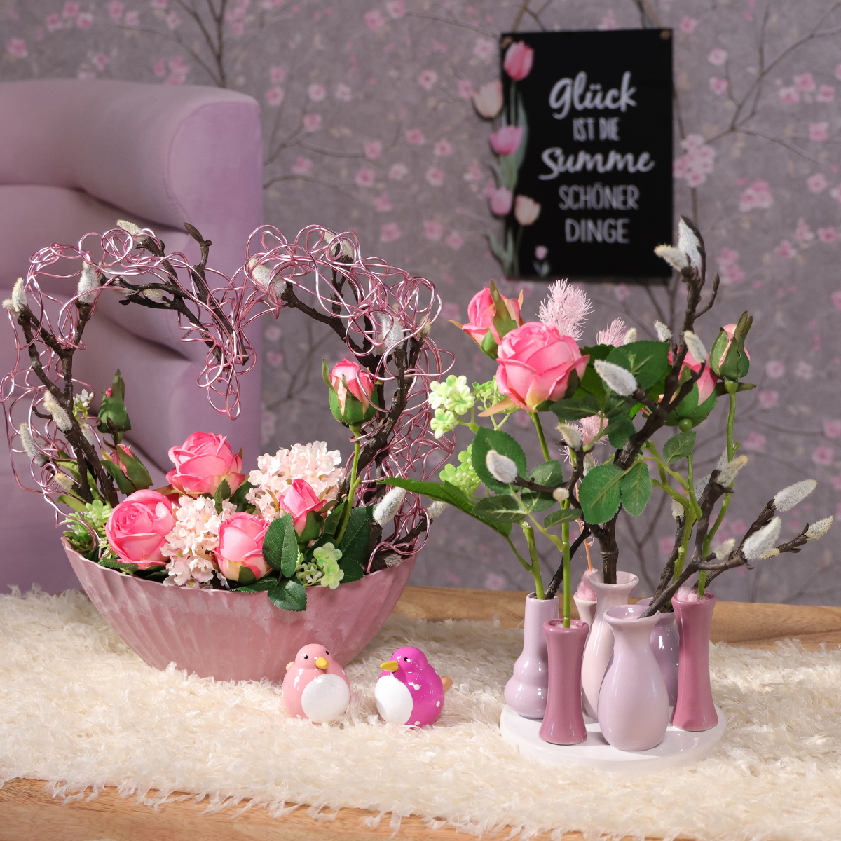 Zoekt u een bijzondere touch voor uw huis? Iets dat frisheid, elegantie en een vleugje moderniteit toevoegt? Deze pastelkleurige vazenset van hoogwaardig keramiek is wellicht precies wat u zoekt. De zes kunstzinnig gevormde vazen, gecombineerd met een stevige witte keramische voet, garanderen veelzijdig gebruik – van tafeldecoratie tot blikvanger op een plank. Of ze nu gevuld zijn met verse bloemen, kleine boeketten gedroogde bloemen, of gewoon afzonderlijk als stijlvolle decoratie worden neergezet, deze kleine vazen voegen altijd de perfecte finishing touch toe. Het harmonieuze kleurenpalet van roze en paars creëert een rustgevende maar uitnodigende sfeer. Een perfecte keuze voor iedereen die stijl en functionaliteit waardeert en zijn of haar woonruimte een moderne uitstraling wil geven.