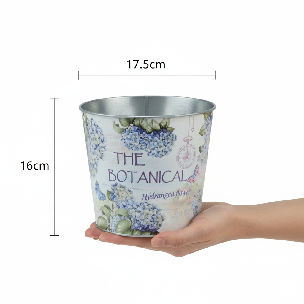 Op de nostalgische print bloeien overal blauw-witte hortensia's en fladderen vlinders rond in dit tuintafereel. De bloempot zelf is vormgegeven als een eenvoudige emmer zonder handvatten. De binnenkant van de pot is gegalvaniseerd, maar door de naden is deze niet waterdicht. Het is daarom aan te raden de binnenkant van de pot met aluminiumfolie te bekleden.