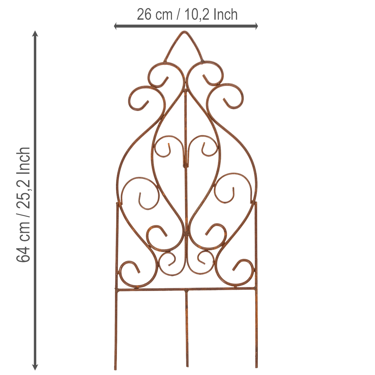 Droomt u van een tuinparadijs dat u elke dag opnieuw betovert? Met dit metalen klimrek in een verfijnde roestbruine afwerking creëert u in een handomdraai een romantisch accent, waarmee u uw rozen of klimplanten stijlvol kunt presenteren. Of het nu als decoratie in het rozenperk, als subtiele blikvanger in de voortuin of als elegante steun voor uw planten in het bloembed is – dit klimrek combineert functionaliteit met een decoratieve charme die een blijvende indruk achterlaat. Gemaakt van hoogwaardig metaal, is het niet alleen robuust, maar voegt het ook een bijzonder accent toe met zijn warme bruine kleur en gebogen details. Dankzij de afmetingen van 64 cm hoog en 26 cm breed past het veelzijdig in uw tuinontwerp als klimrek en tovert het een uitnodigende sfeer tevoorschijn in de lente, zomer en daarna.