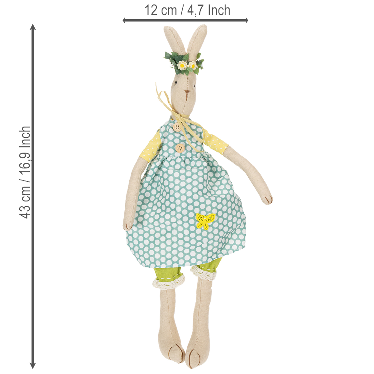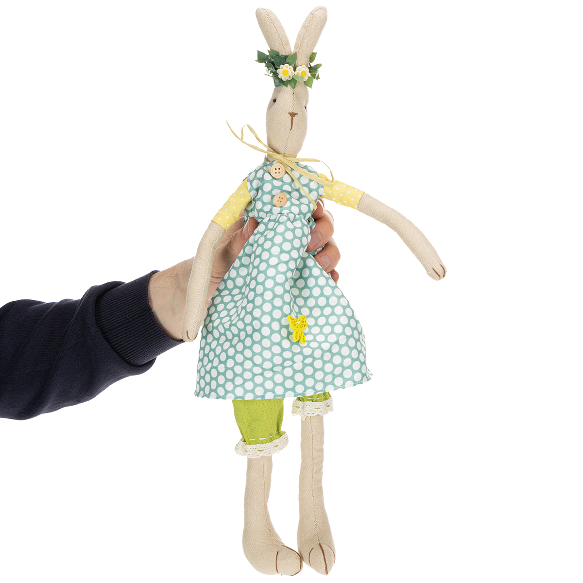 Het schattige konijnenmeisje is gemaakt van een eenvoudige natuurlijke stof en draagt een lenteachtige blauwe jurk met grote witte stippen. Daaronder maken mouwen in geel en wit en mooie groene harembroeken met kanten randen de outfit van het konijntje met jurk compleet. Het prachtige konijn betovert ook met prachtige details zoals houten knopen en een vlinderdecoratie op de mantel, evenals een eenvoudige strik van papieren lint rond de nek. Het knuffelkonijn draagt op zijn kop een filigrane krans van bloemen, wat zijn look compleet maakt.
