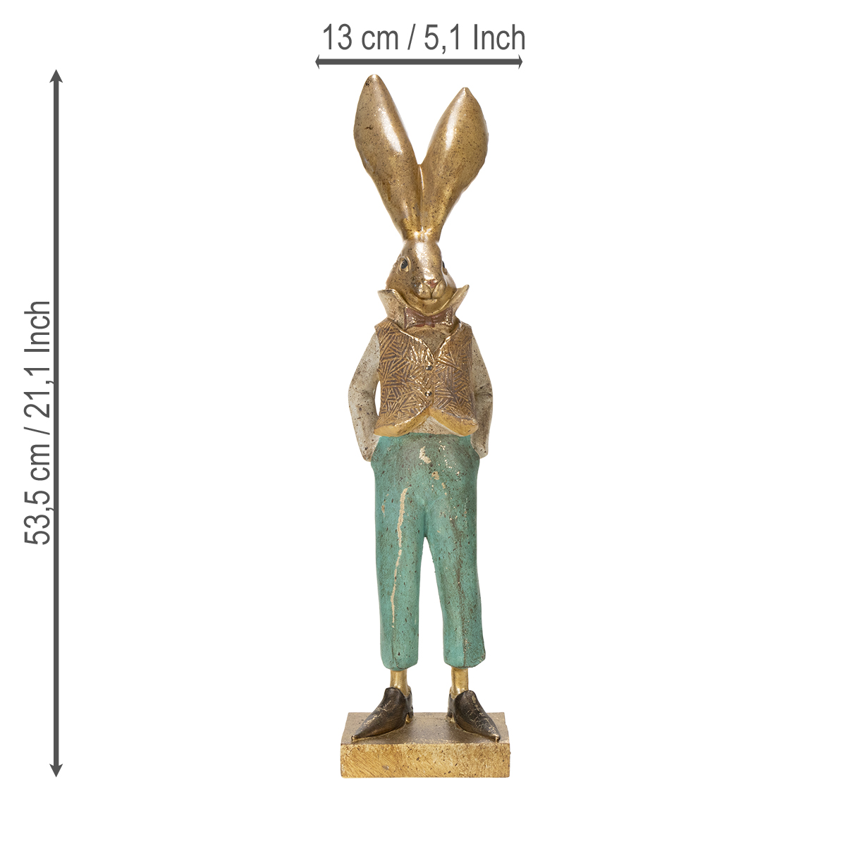 Bent u op zoek naar een charmante decoratie om uw huis een frisse en harmonieuze uitstraling te geven? Dan zal dit decoratieve konijnenbeeldje, met een indrukwekkende hoogte van 53 cm, direct uw aandacht trekken. Met zijn moderne look en liefdevol vervaardigde outfit brengt het niet alleen paasvreugde, maar dient het ook het hele jaar door als stijlvol accent. Stelt u zich voor hoe dit elegante bruin-groene konijn, gemaakt van hoogwaardig polystone, een bijzondere touch zal geven aan uw tafel, dressoir of hal. Perfect om de grijze winterdagen op te fleuren; het gedetailleerde vakmanschap maakt het een echte blikvanger – alsof het een klein verhaaltje te vertellen heeft. Maak uw huis uniek en breng een vrolijke maar elegante sfeer in uw kamers!