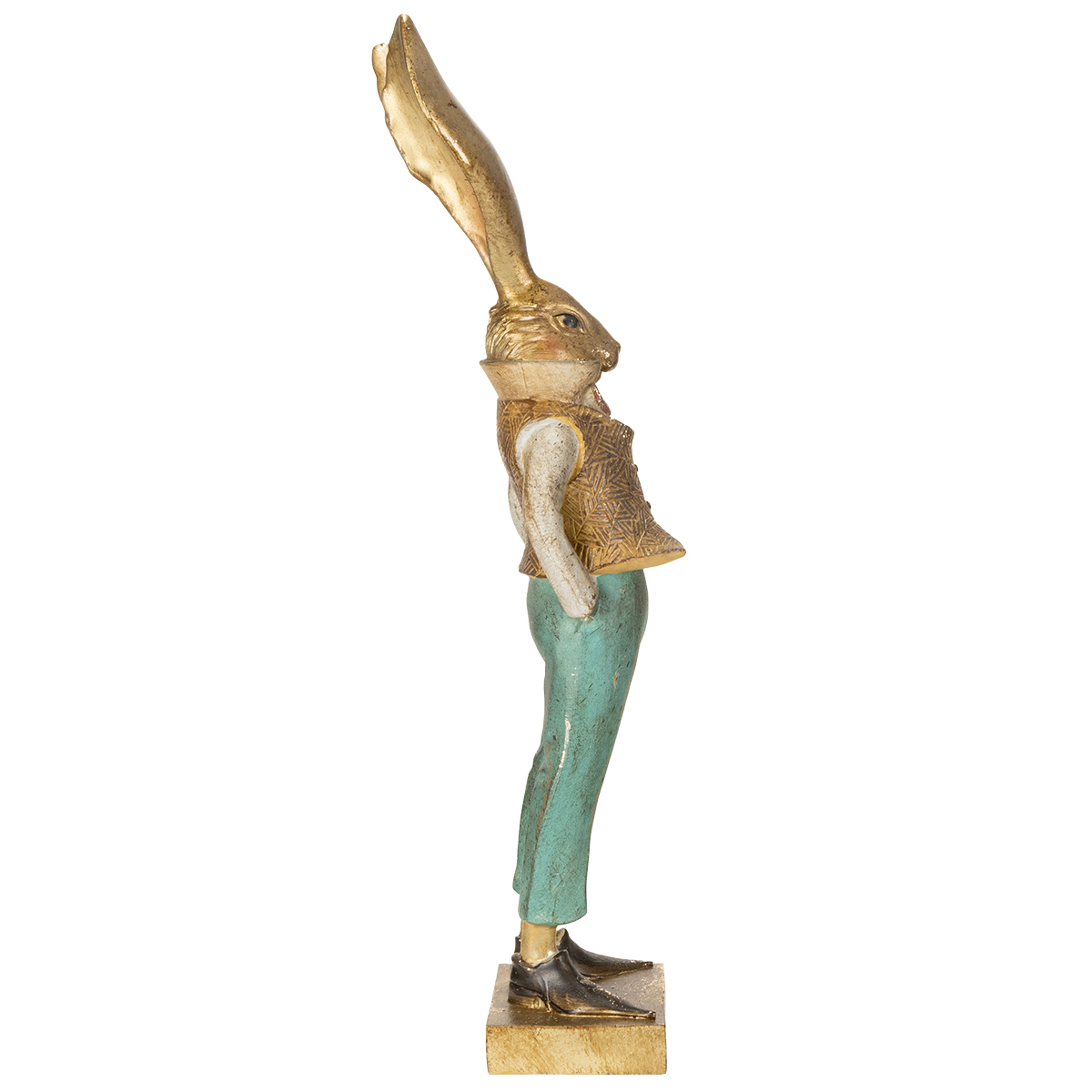 Dit konijnenbeeldje maakt indruk met zijn harmonieus gecoördineerde ontwerp. De warme bruine tint van het lijfje en het delicate groen van de broek vormen een aangenaam contrast dat zowel modern als tijdloos oogt. Vooral de gepolijste details van het polystone geven dit beeldje een levendige en levensechte uitstraling. Is het u opgevallen hoe liefdevol de kleine details zijn aangebracht? Van de charmante gezichtsuitdrukking tot de gouden accenten op zijn outfit – hier ontmoet klassieke paasdecoratie moderne chic.
