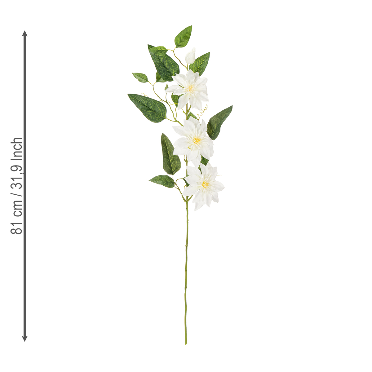 De indrukwekkende lengte van 81 cm geeft je de vrijheid om de tak zowel in hoge als lage vazen te schikken. Een vaas op de vloer of tafel wordt direct een blikvanger. De clematistak is bijzonder geschikt voor lichte, luchtige ruimtes of als decoratief element voor bruiloftstafels, recepties of stijlvolle kantoorarrangementen. Desgewenst kan de tak ook gecombineerd worden met andere transparante of witte sierbloemen voor een uniek bloemstuk. Wat dacht je bijvoorbeeld van een vleugje vintage door de tak in rustieke vazen te presenteren?