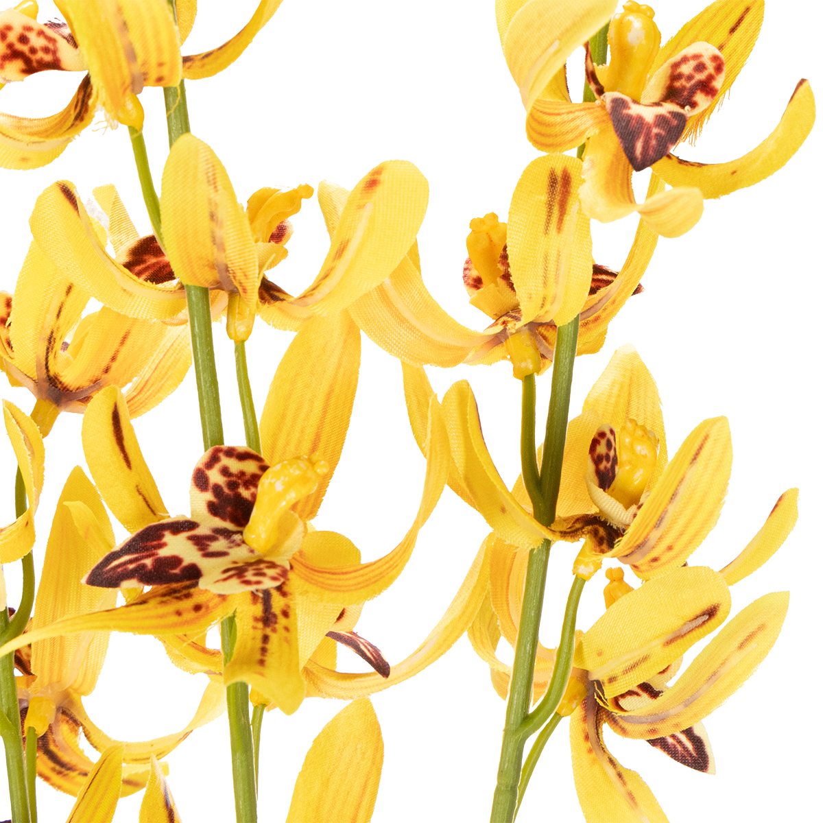 De Cymbidium-orchidee wordt beschouwd als een symbool van elegantie en verfijning. Dankzij de hoogwaardige afwerking is hij vrijwel onverwoestbaar en tegelijkertijd een echte blikvanger. De combinatie van geel zijden doek, dat een authentieke uitstraling geeft, en een flexibele plastic steel maakt hem niet alleen visueel aantrekkelijk, maar ook praktisch voor uw creatieve projecten. Gebruik hem om grote vazen te versieren of combineer de orchidee met groene takken en andere kunstbloemen voor indrukwekkende arrangementen.