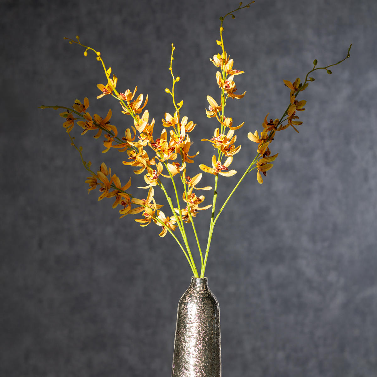 Voor een frisse, moderne look is de bloemstengel bijzonder geschikt voor combinaties met eenvoudige glazen vazen of metalen decoratieve elementen. Liever iets romantischer? Combineer hem dan met rozen en kaarsen in zachte pasteltinten. Het warme geelgroen-bordeauxrode kleurenpalet brengt frisheid in ruimtes met lichtgekleurd meubilair en past harmonieus in elegante omgevingen. Een bijzonder praktische eigenschap: de lange houdbaarheid in de vaas maakt deze orchidee de perfecte keuze voor ruimtes waar echte bloemen moeilijk te onderhouden zijn, zoals seminarruimtes of wachtruimtes in medische praktijken.