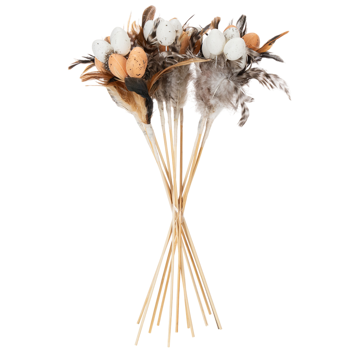 Kunstmatige kwarteleieren, decoratieve veren op een stokje, 36 cm, 12 stuks