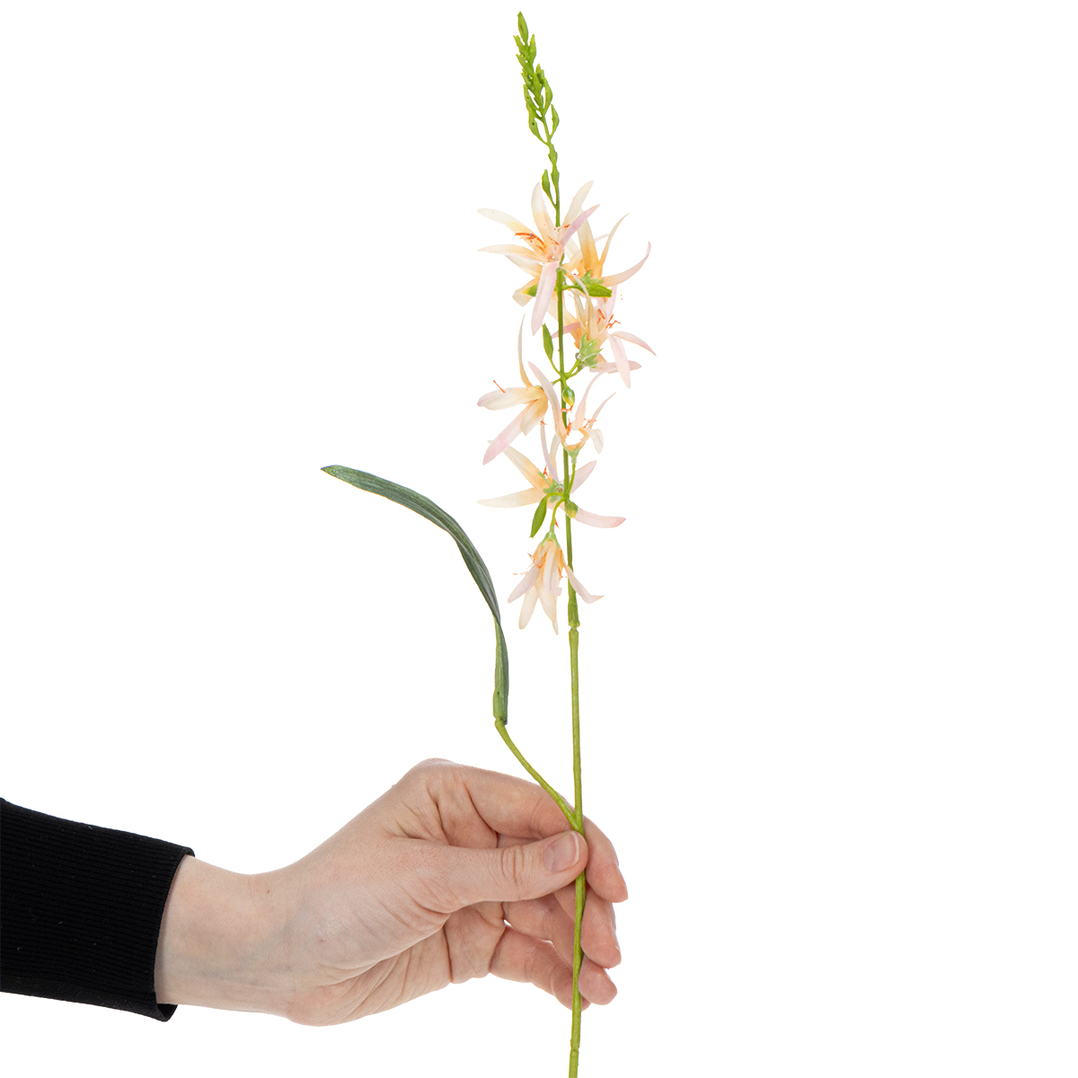 Deze kunstlelie met lange steel maakt indruk met zijn hoogwaardige polyester en kunststof materialen. Deze combinatie zorgt niet alleen voor een realistische uitstraling, maar ook voor duurzaamheid. De fijne details van de bloemblaadjes en de levensechte kleuren geven de lelie een charmante, bijna bedrieglijk echte look. Vooral op bruiloften, waar elegant design en tijdloze elegantie gewenst zijn, komt de lelie volledig tot zijn recht. Of het nu als middelpunt van een tafelarrangement is, in een hoge vaas op de vloer, of gewoon in een moderne vaas op de receptietafel – deze lelie is een ware blikvanger.