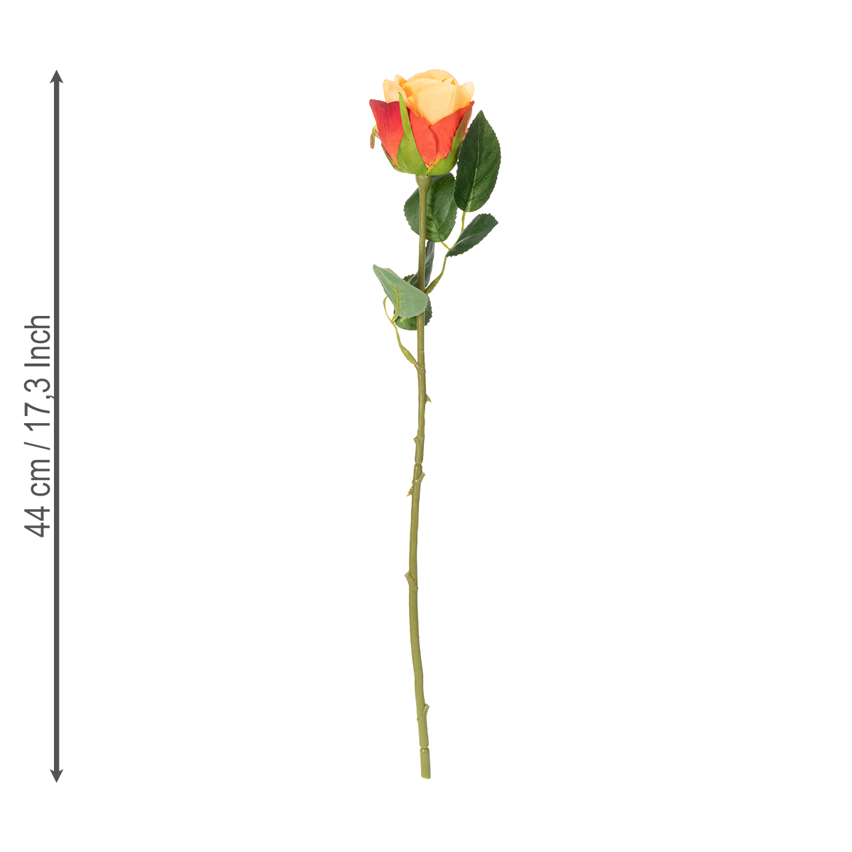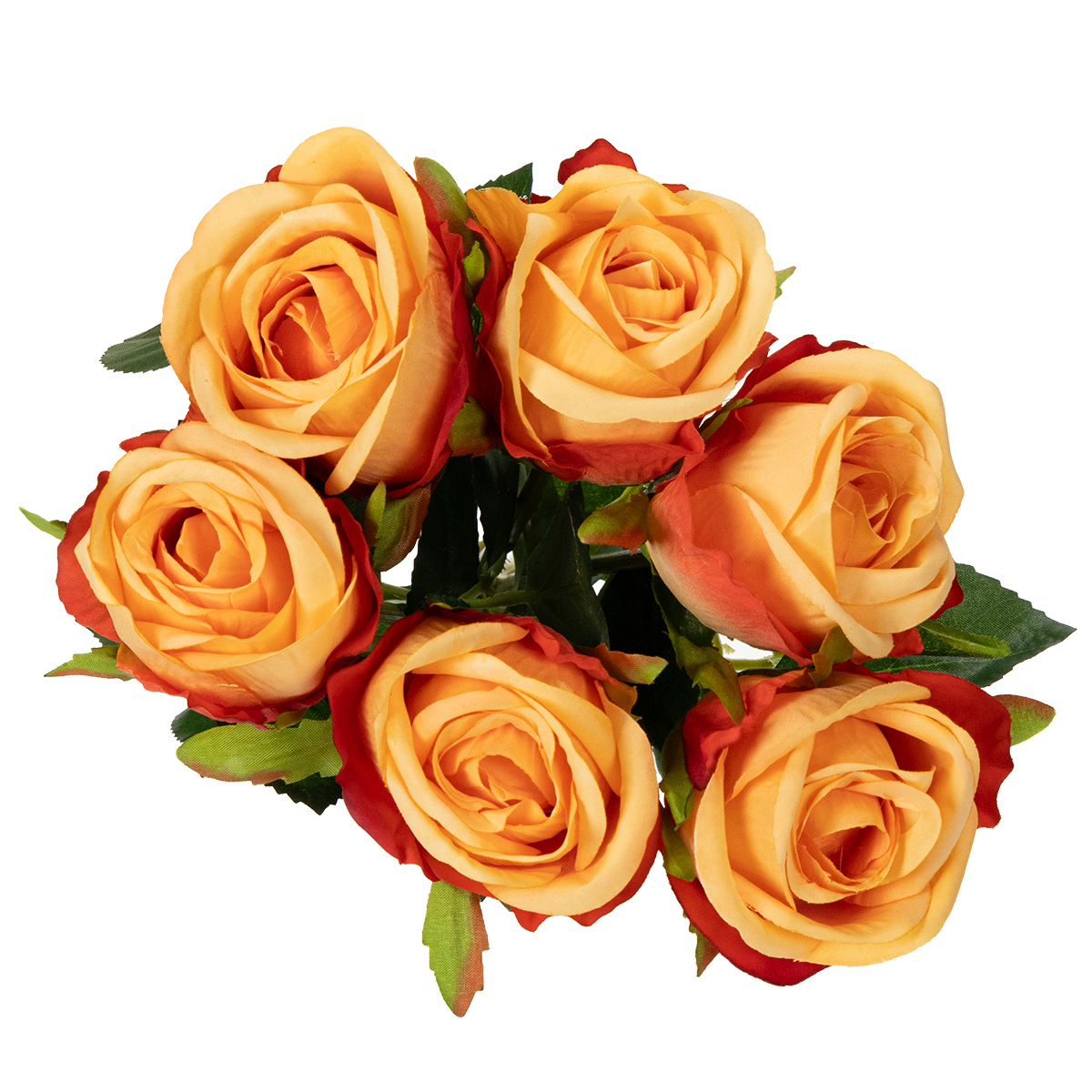 Dit arrangement met zes oranje rozen is een echte alleskunner in de wereld van interieurdecoratie. Met een hoogte van 44 cm komt het bijzonder elegant tot zijn recht in hoge vazen. Het zorgvuldige vakmanschap met hoogwaardig polyester en plastic geeft de rozen een natuurlijke uitstraling die zelfs van dichtbij overtuigend is. De warme oranje tinten van de bloemen brengen lichtheid en helderheid in uw kamers, terwijl de groene bladeren een vleugje natuur toevoegen. Of u nu uw woonkamer wilt opfrissen of op zoek bent naar een stijlvolle aanvulling op uw eettafel – dit boeket is de perfecte keuze.