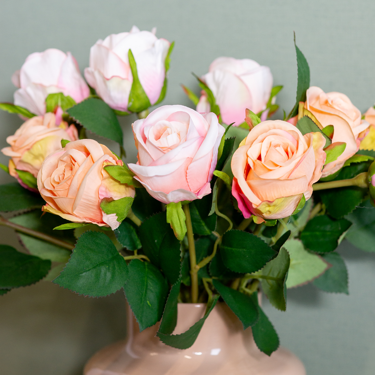 Houdt u van de charme van rozen, maar wilt u het gedoe van het verzorgen ervan vermijden? Geen probleem! Met ons boeket kunstrozen haalt u de tijdloze schoonheid van de koningin der bloemen rechtstreeks in huis. Perfect voor iedereen die elegante decoratie waardeert zonder verse bloemen. Of het nu als blikvanger in de woonkamer is, als charmante tafeldecoratie voor speciale gelegenheden of als stijlvol cadeau – dit rozenboeket geeft elke ruimte een bijzondere sfeer. De delicate roze zijden bloesems in combinatie met groene bladeren zien er zo ongelooflijk realistisch uit dat u bijna zou vergeten dat ze kunstmatig zijn. Uw gasten zullen versteld staan!