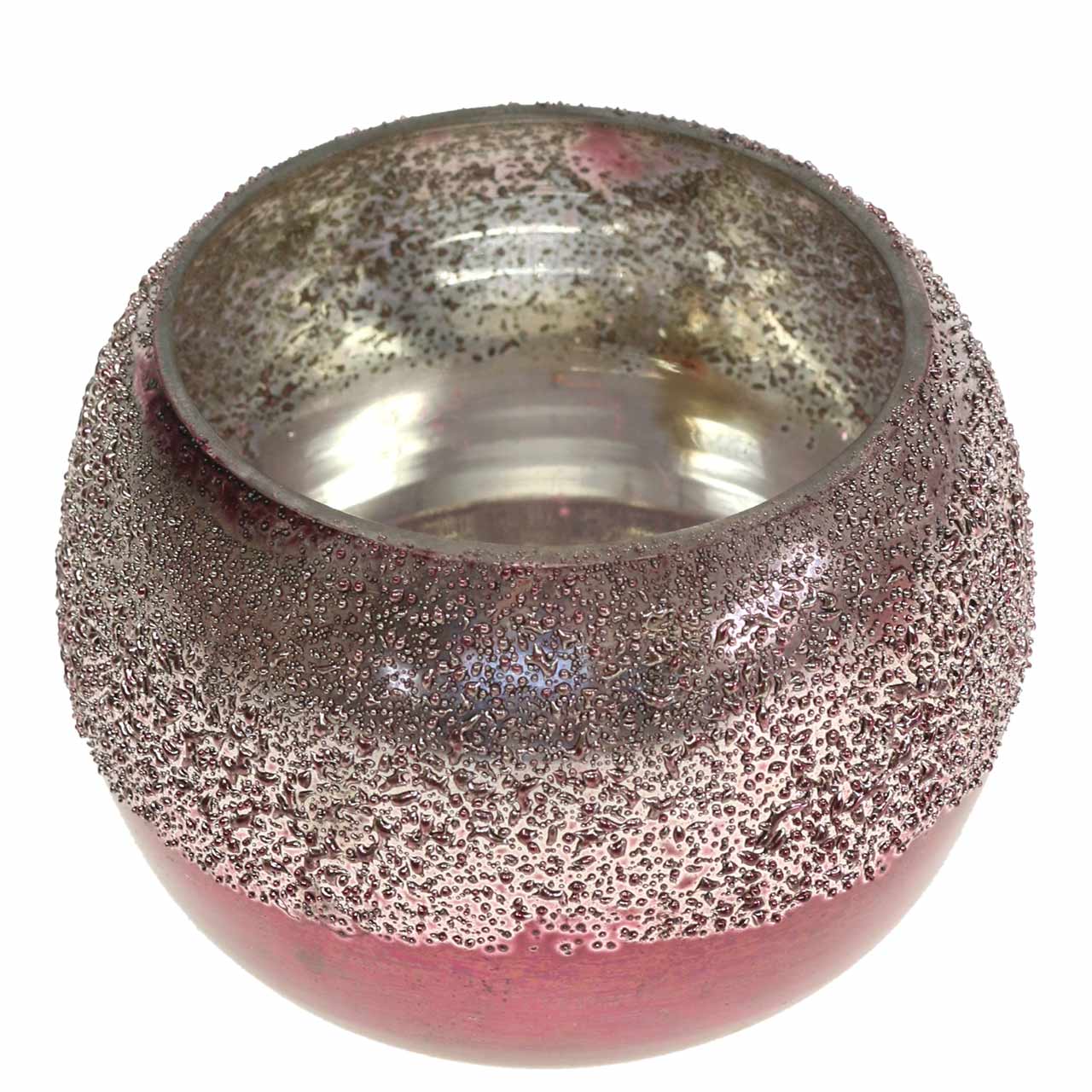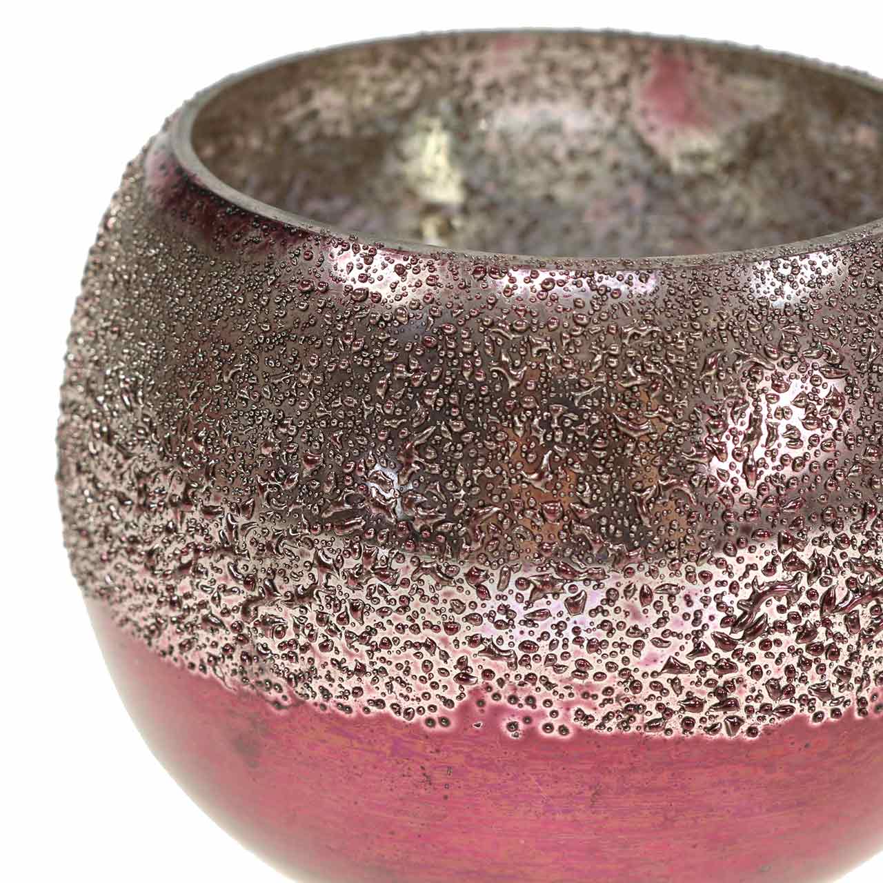 Het roze glazen windlicht ziet er spannend anders uit! Door de verschillende oppervlaktebehandeling schijnt het theelicht in drie kleuren: het bovenste gedeelte met de aantrekkelijke druppelstructuur is lichtroze, terwijl de schitterende onderste helft roze is. De zilveren binnenkant vermenigvuldigt de glans van het theelichtje en laat je decoratie stralen.