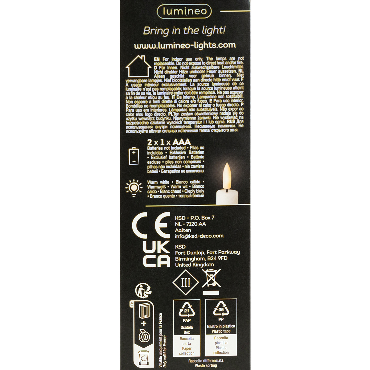 - Beoogd gebruik: LED-kaarsen voor binnen- en buitengebruik voor decoratie en verlichting.