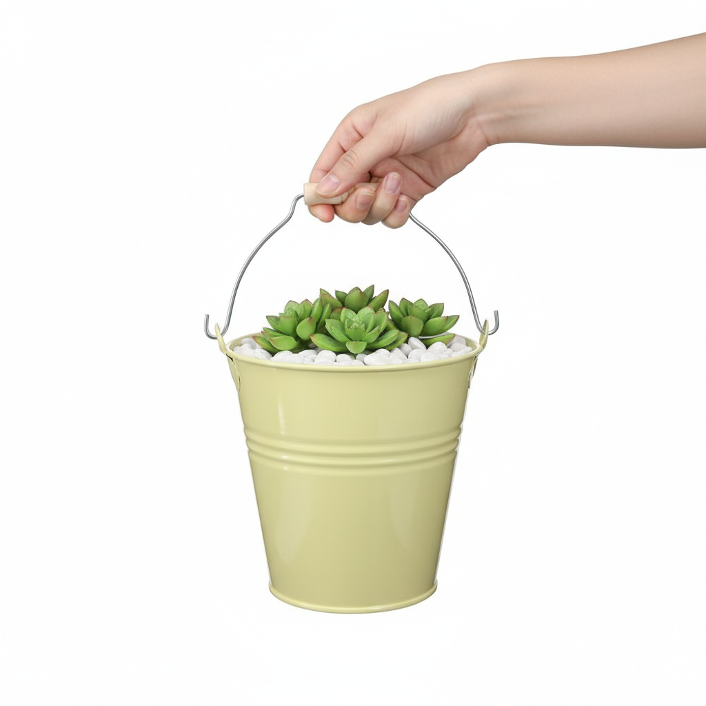 Chique metalen emmer als bloempot in groen-geel - de perfecte decoratieve partner voor je huis