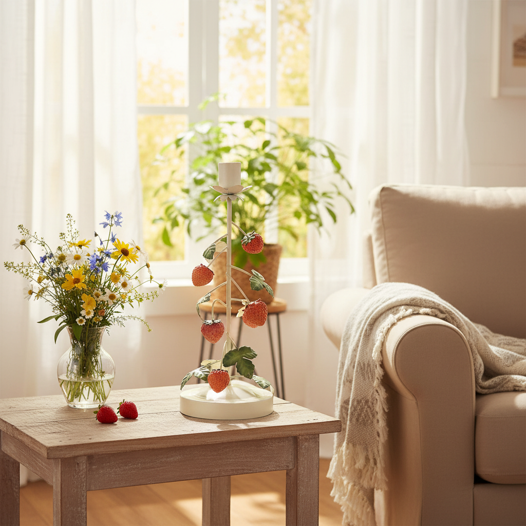 Exclusieve metalen kaarsenhouder met aardbeiendecoratie – ideaal voor uw zomerdecoratie