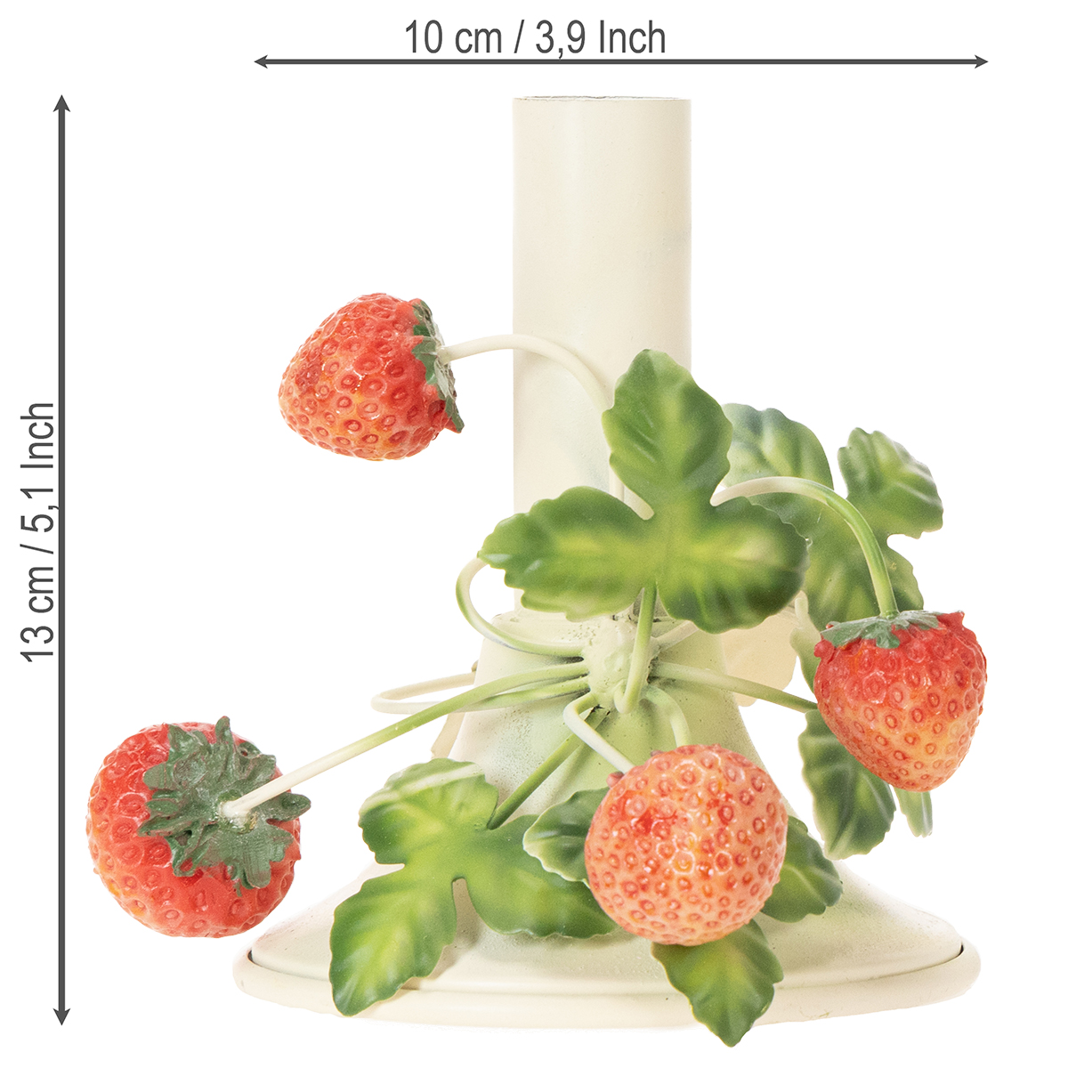 Een vleugje zomer in huis: de metalen kaarsenhouder combineert eenvoudige elegantie met een vleugje zomerse lichtheid. Deze kandelaar is niet alleen ontworpen als functionele kaarsenhouder, maar ook als decoratief hoogtepunt voor elke zomerse decoratie. De crèmekleurige kandelaar, omringd door tere aardbeienplantjes van metaal en kunststeen, brengt de kleuren en charme van een zonnige zomerdag in uw huis. De gedetailleerde stengels en bladeren van groen metaal en de realistisch ogende aardbeien van kunststeen in de kleuren rood, geel en oranje zorgen voor fruitige accenten en doen denken aan een heerlijk dessert met verse aardbeien. Deze unieke combinatie van kleuren en materialen maakt de kaarsenhouder tot een aantrekkelijk pronkstuk op uw eettafel en in uw tuin.