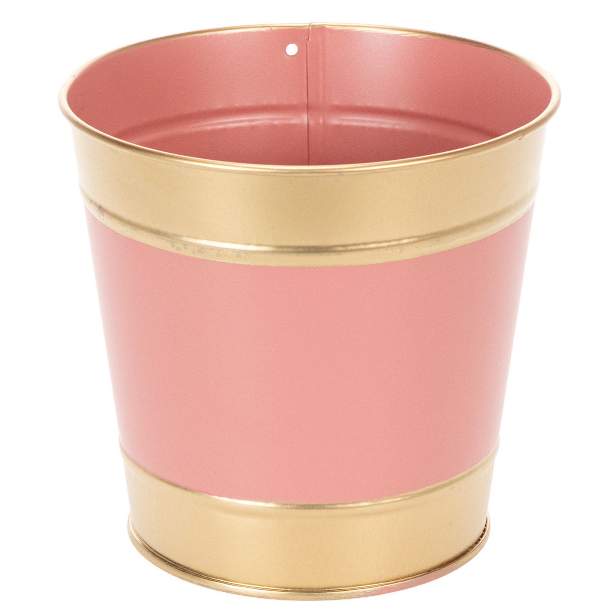 De plantenbak heeft de vorm van een typische blikken emmer met een extra gouden rand aan de boven- en onderkant. In het midden zit een streep in een van de vier kleuren bruin, beige, roze en perzik. De set van vier is qua kleur afgestemd en kan zo prachtig samen worden opgesteld, bijvoorbeeld op een bloemenvoetstuk.