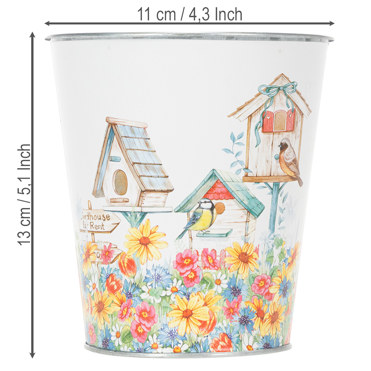 Metalen pot met motief, plantenbak met vogelhuisjes, blikken emmer H13cm Ø11,5cm