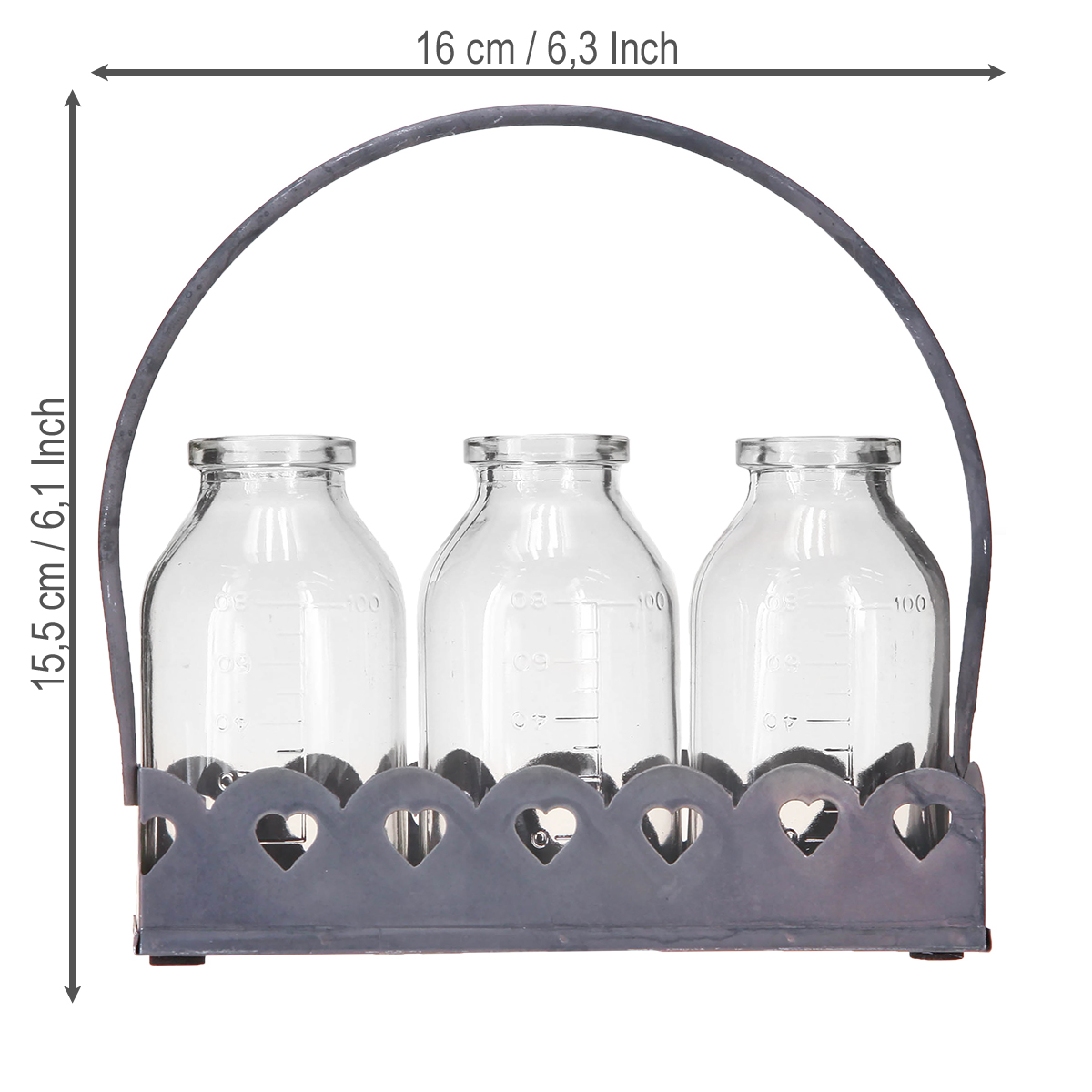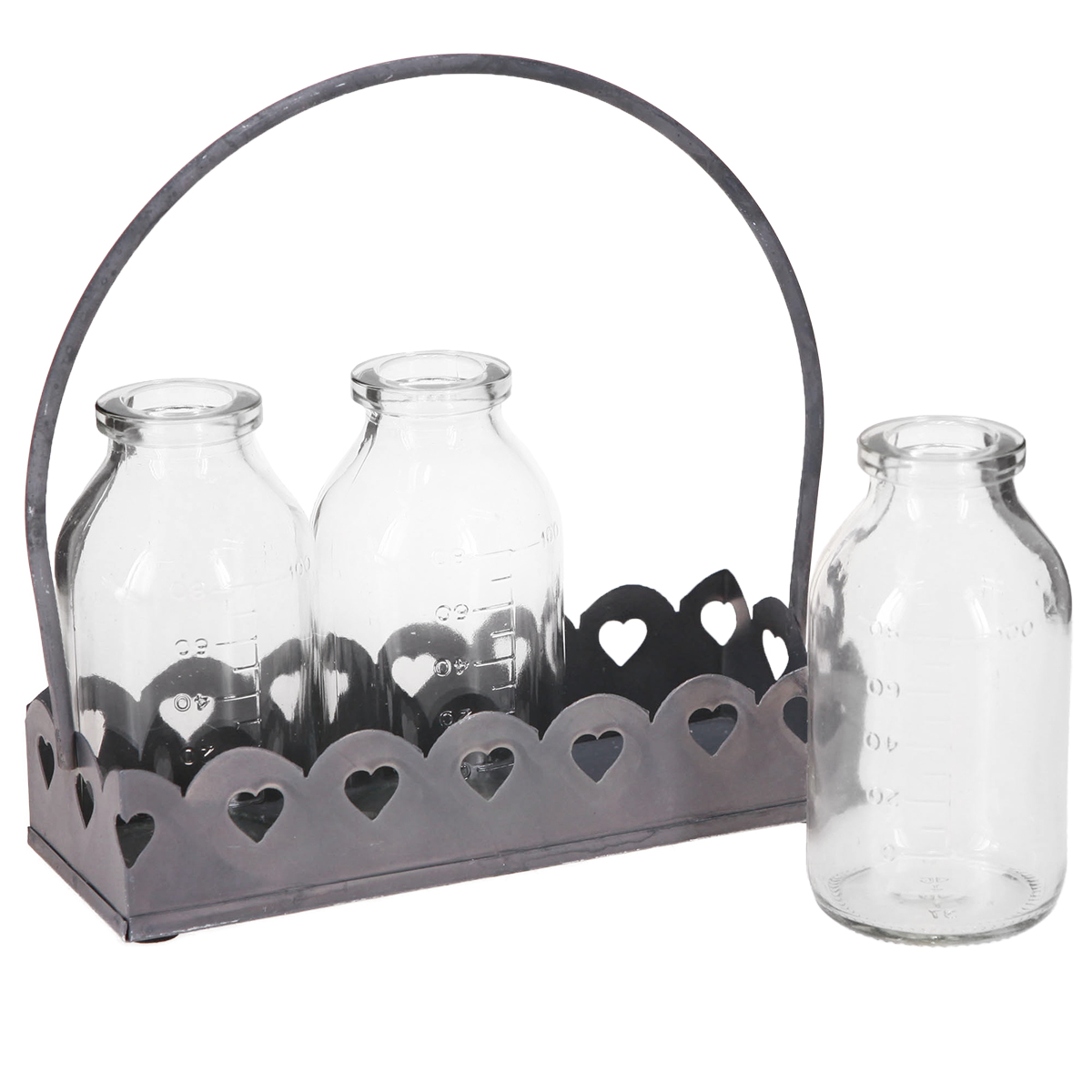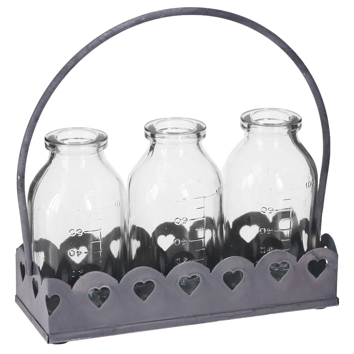 Ervaar de magische aantrekkingskracht van miniflesdecoraties als vazen op een dienblad. Deze charmante decoratieve flessen zijn ideaal om een vleugje nostalgie aan uw leefruimte toe te voegen. Elk van de drie glazen vazen doet denken aan antieke apothekersflessen en staat op een stevig, grijs metalen dienblad met uitgestanste hartmotieven. Dit detail in retrostijl voegt een romantisch tintje toe aan het arrangement, waardoor het ideaal is als bruiloftsdecoratie, gezellige tafeldecoratie of als cadeau-idee. Dankzij de afmetingen op de flessen zijn ze voor allerlei doeleinden te gebruiken: van het snel planten van kleine bloemstukjes tot het bewaren van kruiden of knutselmaterialen.