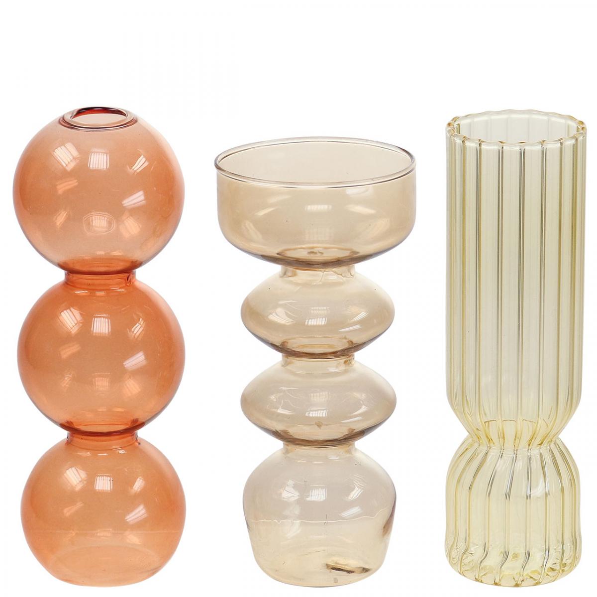 Deze set bevat drie mini glazen vazen. De glazen vazen zijn er in drie verschillende vormen en kleuren. Presenteer verkorte bloemen in de decoratieve glazen vazen.Je krijgt bij deze set een gele, een oranje en een bruinachtige minivaas. Het geel toont een mooi lamellair retroreliëf en een ranke vorm. De oranje siervaas daarentegen is ontworpen met drie rondingen in een romantische bolvorm. Het kleine bruine glazen vaasje doet zelfs denken aan een glazen waxinelichthouder.