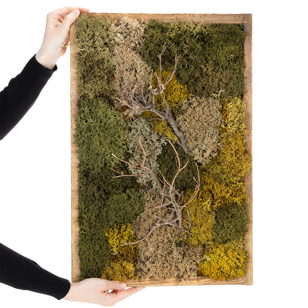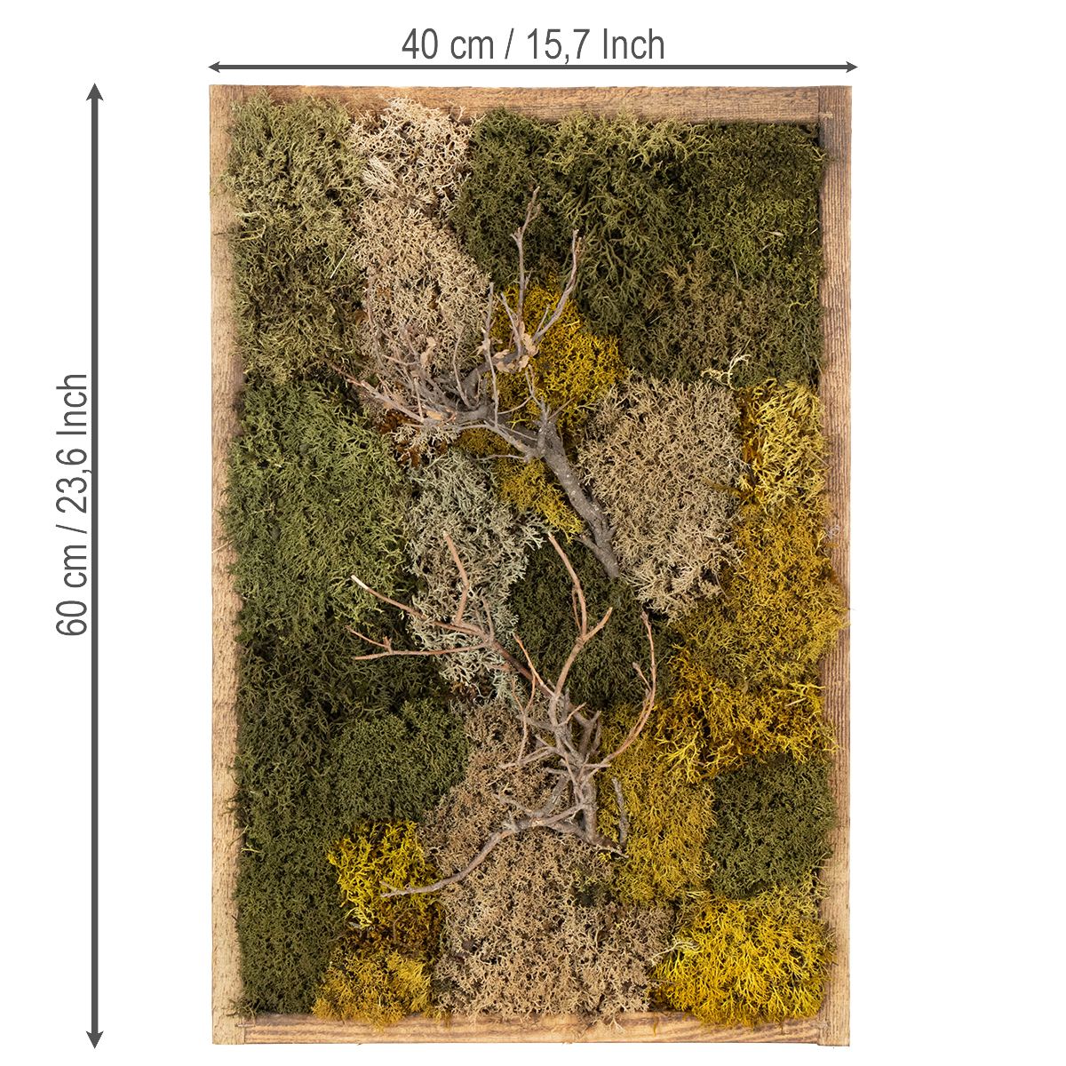 Dit hoogwaardige moskunstwerk is een echte eyecatcher voor iedere muur. De fijn op elkaar afgestemde samenstelling van verschillende soorten mos en natuurlijke takken geeft elke ruimte een bijzonder tintje. De rustgevende groene tinten en authentieke textuur van het mos creëren een rustige en comfortabele sfeer - perfect voor wachtkamers, kantoren of zelfs thuis.
