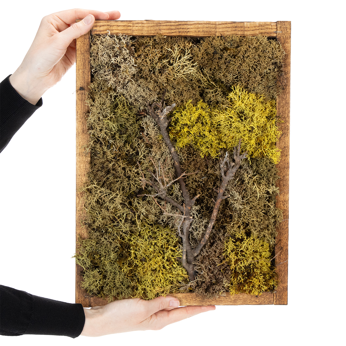 Ontdek het rustgevende effect van echt mos in een stijlvol kader. Onze geconserveerde mosafbeelding is de perfecte groene wanddecoratie voor elke kamer - of het nu een woonkamer, kantoor of meditatieruimte is. Met een uniek patroon van egelmos in verschillende tinten groen en een centraal takkenmotief is het moskunstwerk een eyecatcher in jouw interieur.