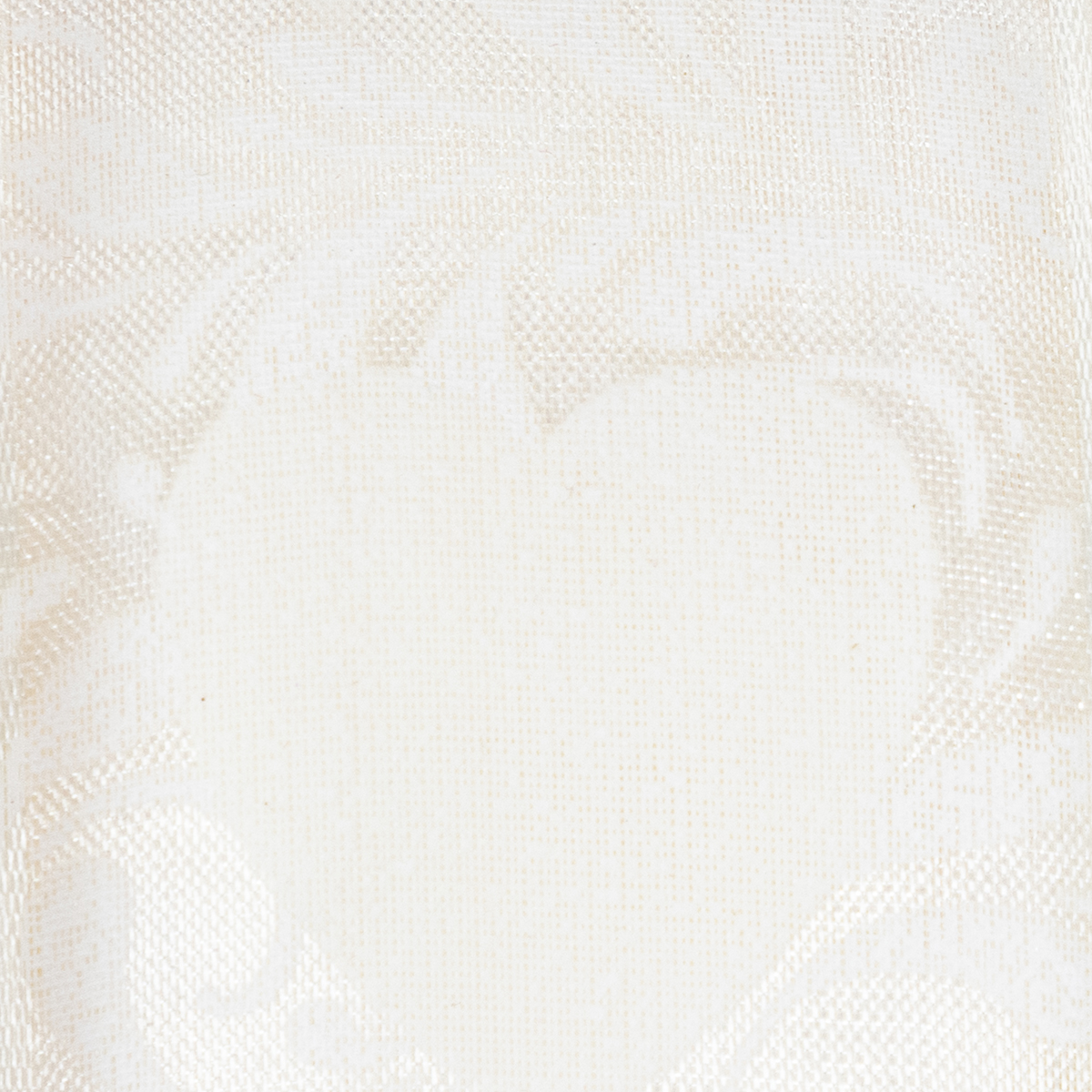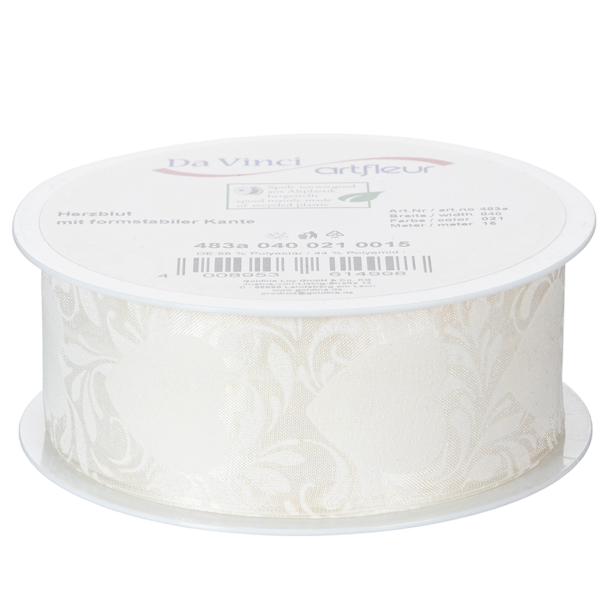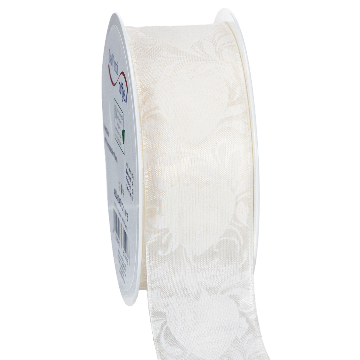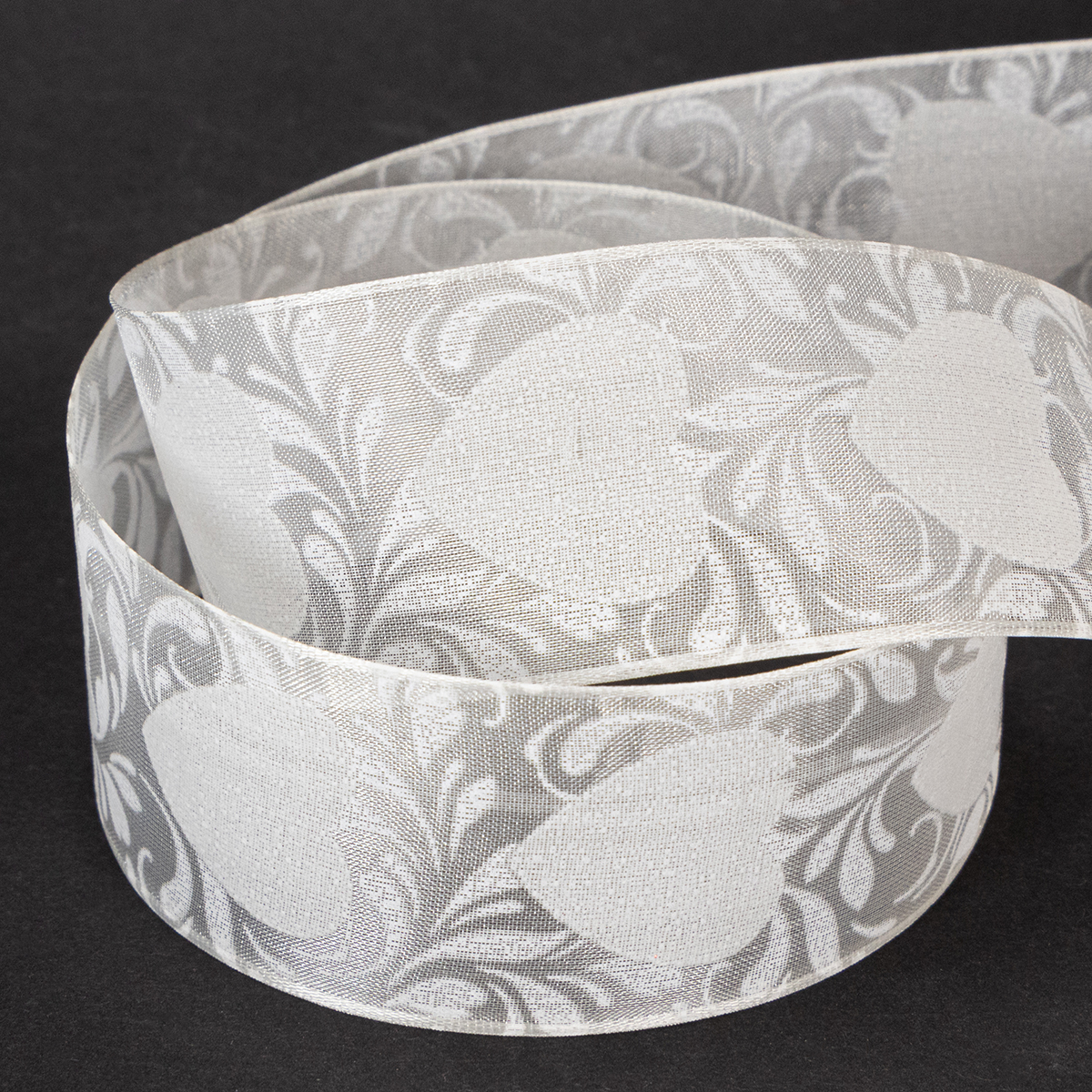 De delicate hartjes zijn omgeven door lommerrijke takken als bloemen en gedrukt op de transparante organzastof, waardoor het lint een verfijnde uitstraling krijgt die doet denken aan kant. De warme crèmetint van het decoratieve lint is tijdloos en straalt tegelijkertijd een zekere nostalgie uit.