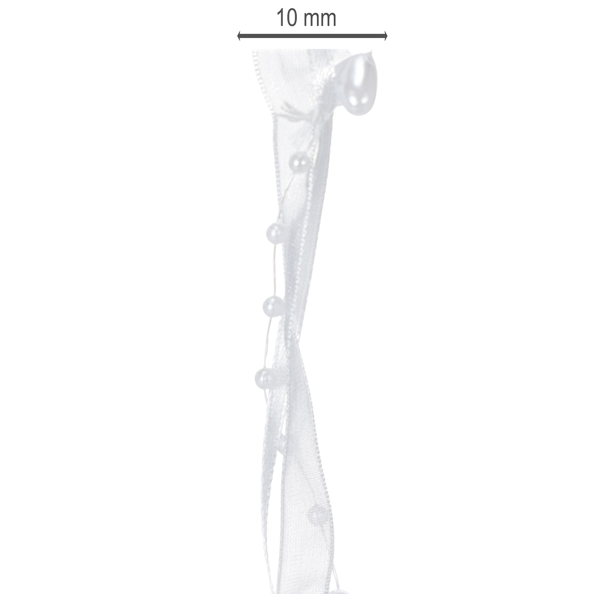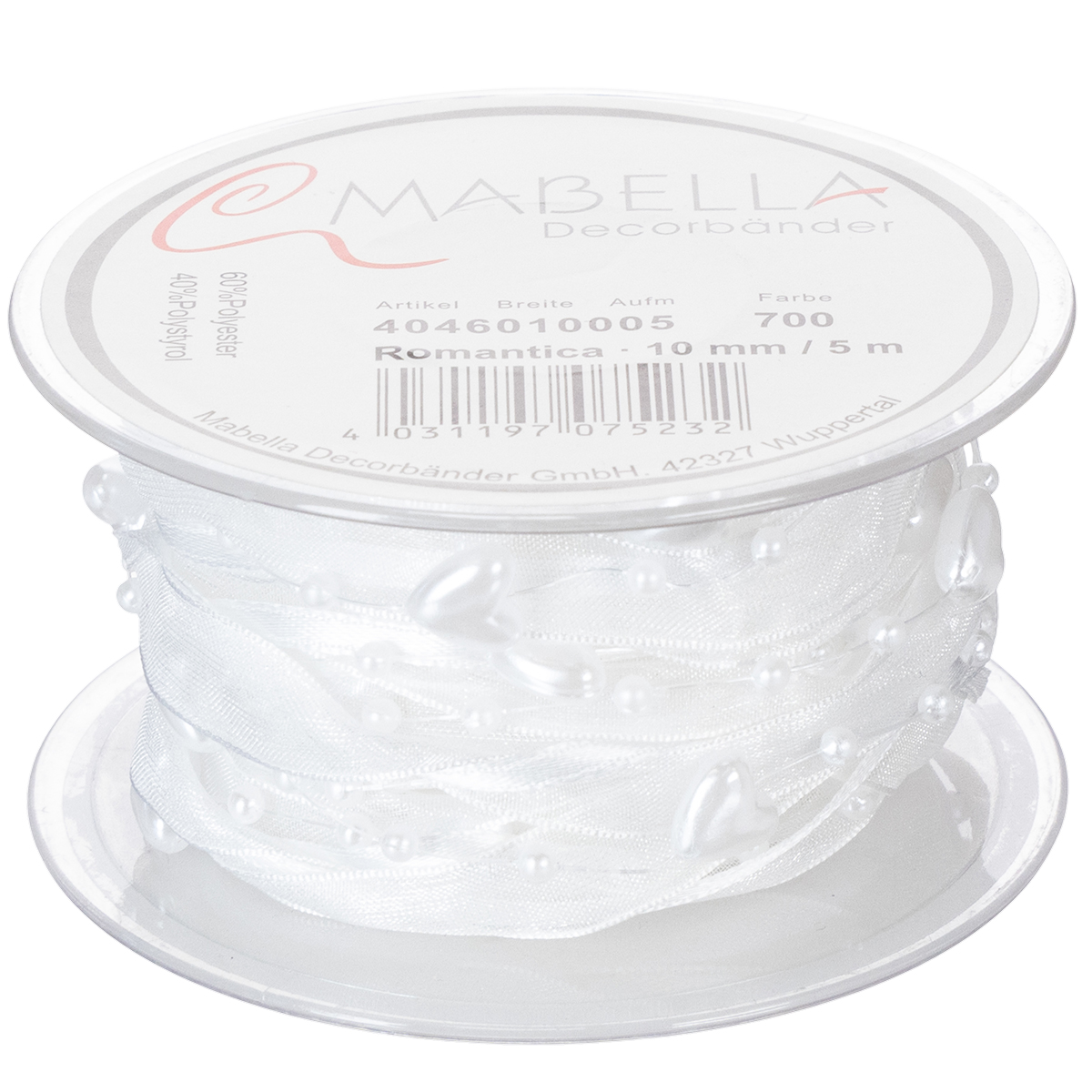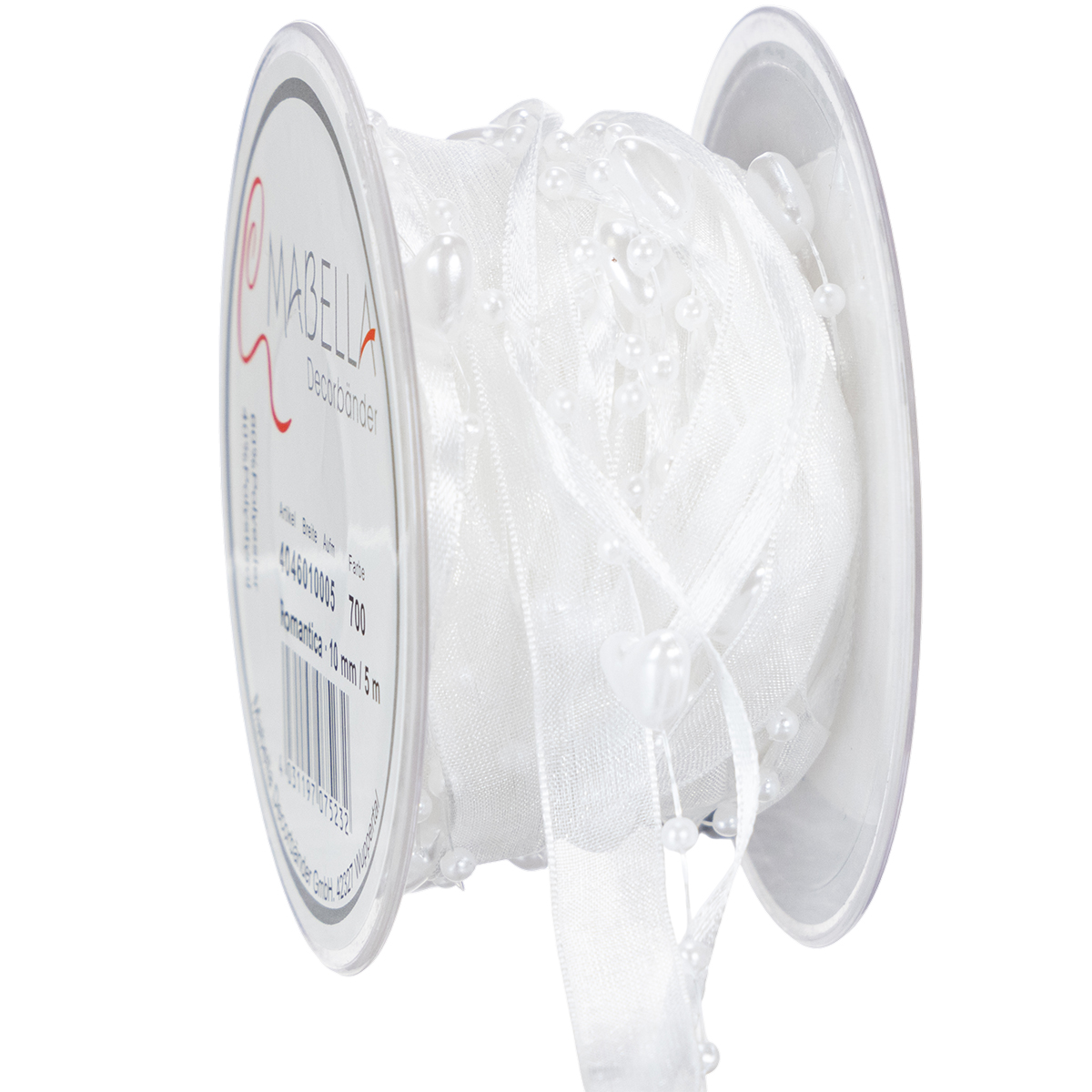 Organza lint voor bruiloftsdecoratie, wit, 10 mm breed, 5 m lang, met hartjes en parels.