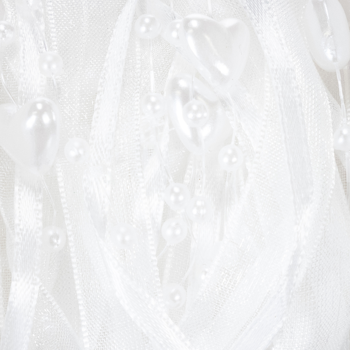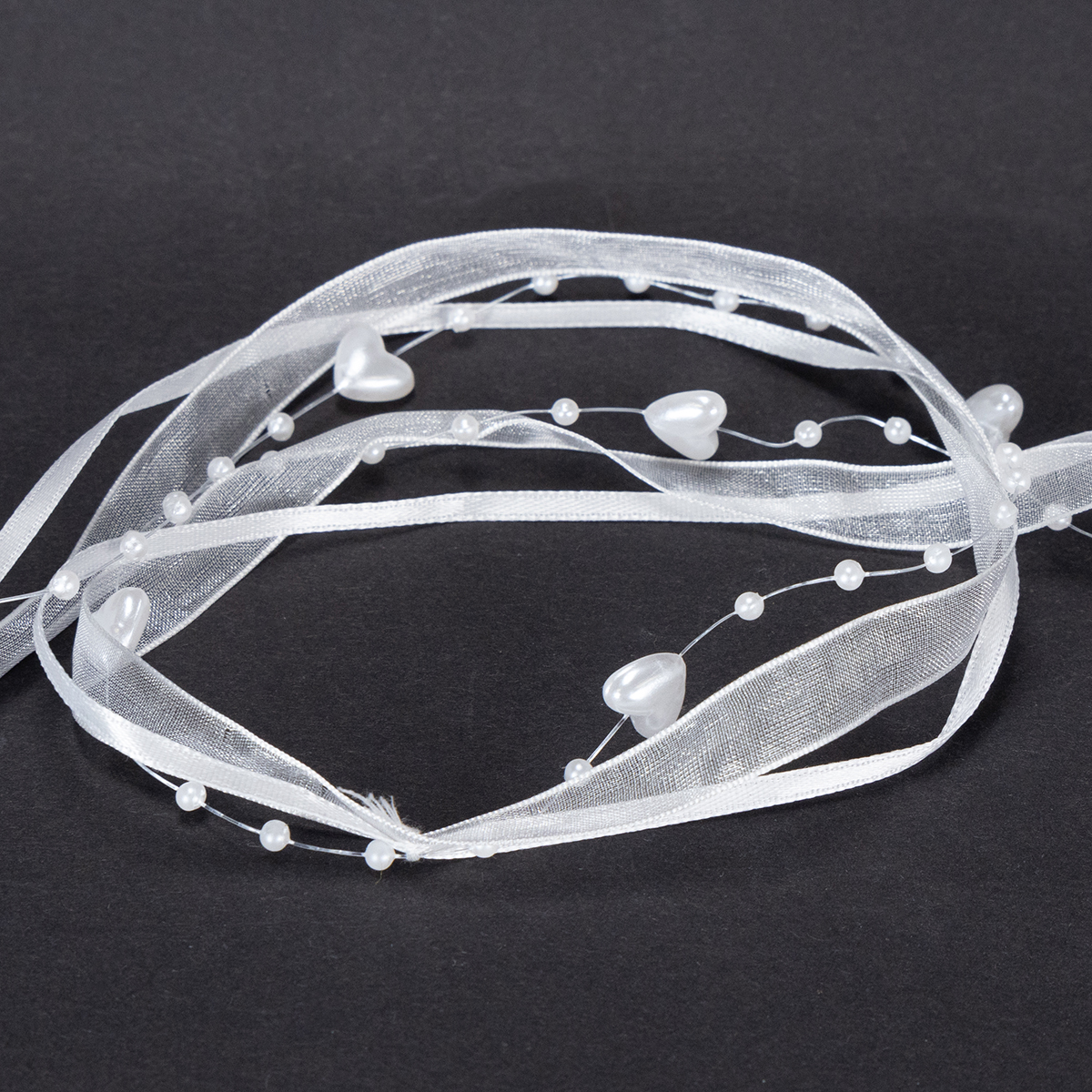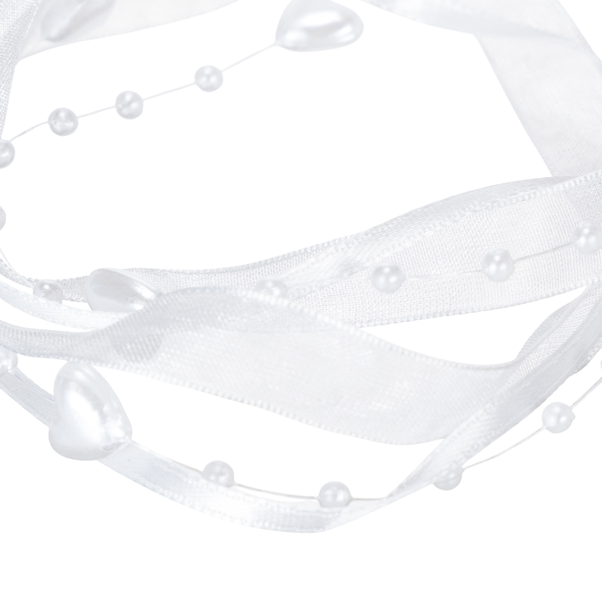 Productnaam: Organza lint voor bruiloftsdecoratie, wit, 10 mm breed, 5 m lang, met hartjes en parels.