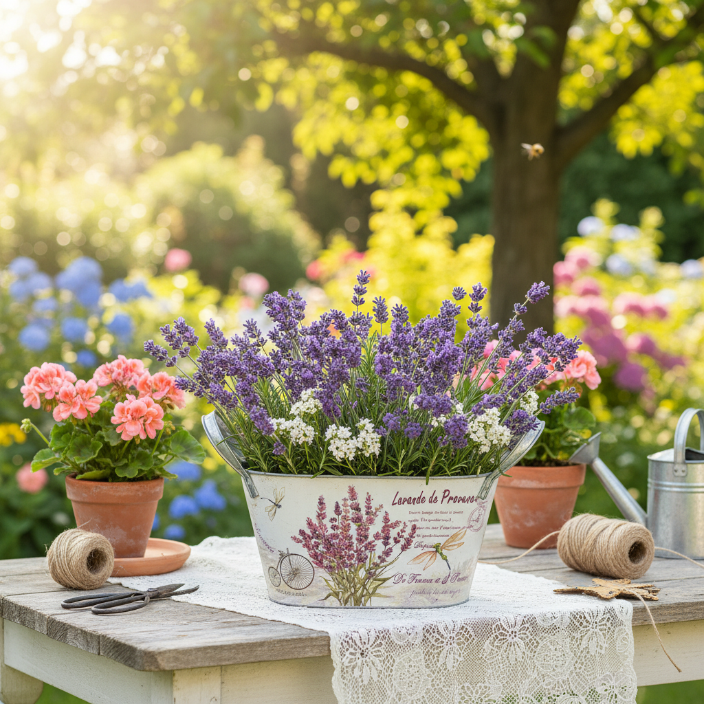 Creëer een zomers arrangement van lavendel in de bloemenschaal of voorzie de pot van folie zodat je de metalen decoratie kunt planten.