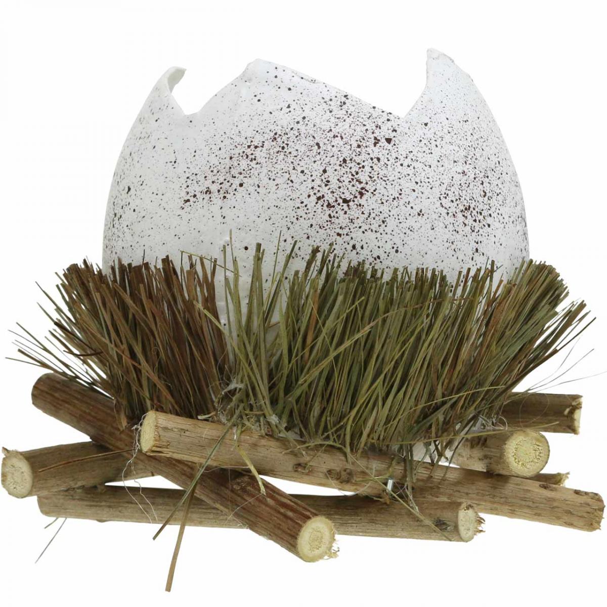Het decoratieve witte ei met bruine spikkels wordt in een bed van echt gedroogd gras gelegd, dat op een krans van kleine boomstammen wordt geplaatst. - Het geheel ziet er dus niet alleen uit als een echt vogelnest dat je in de natuur zou kunnen vinden, maar is ook veilig en stabiel.