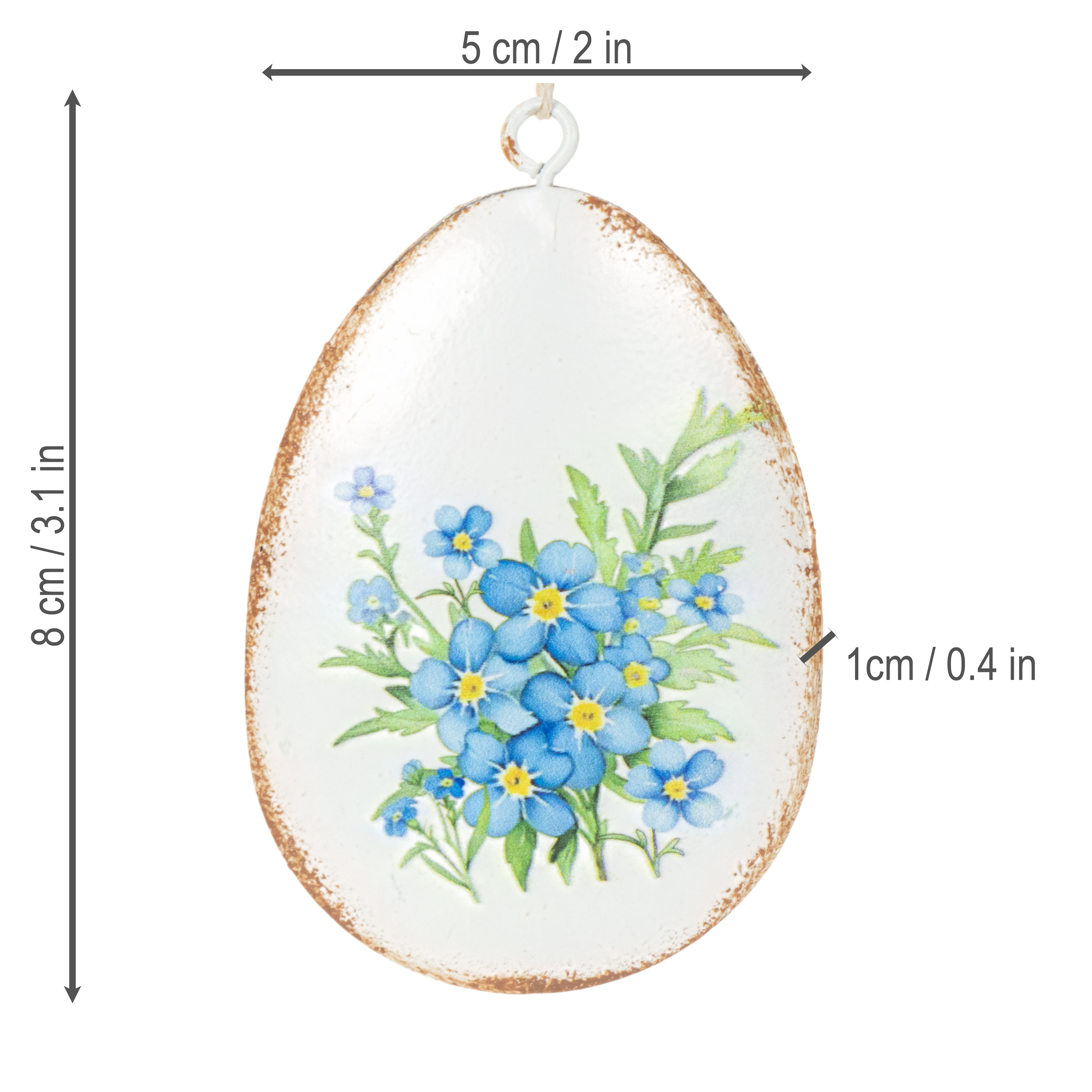 Deze decoratieve metalen paaseieren imponeren met hun formaat en uitstraling. Met een hoogte van 8 cm en een diameter van 5 cm hebben ze de perfecte maat voor diverse toepassingen. De licht matte witte basis wordt aangevuld met vier verschillende bloemmotieven die de lente tot leven brengen: van delicate vergeet-me-nietjes tot levendige narcissen. Hun subtiele vintage look maakt ze bijzonder smaakvol en een perfecte aanvulling op retro, shabby chic of landelijke decoraties.