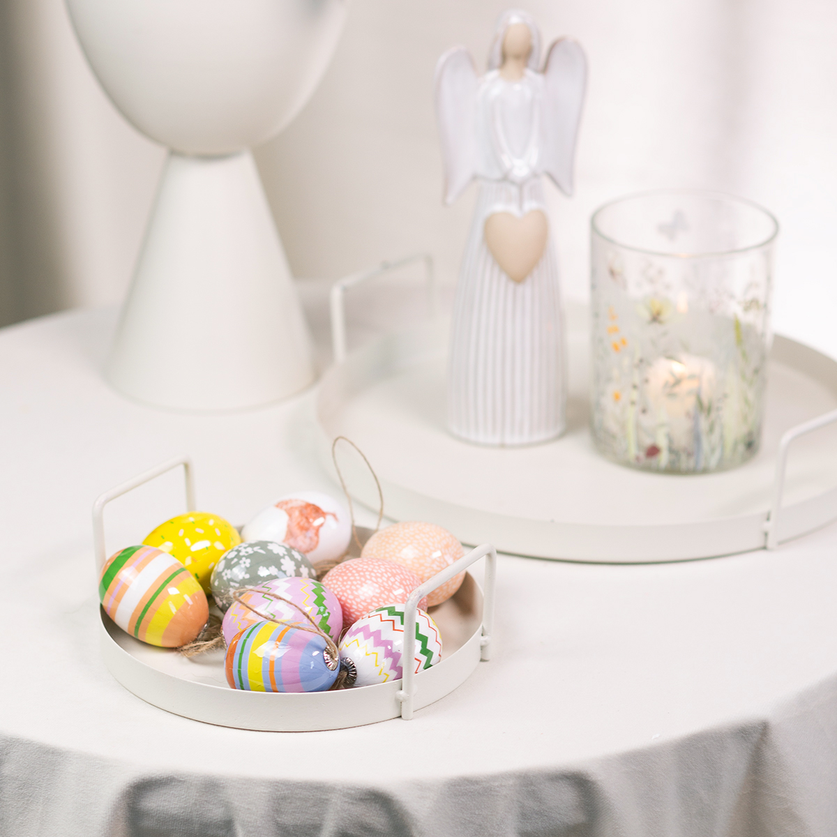 Deze charmante paaseitjes zijn zowel praktisch als stijlvol. Elk van de twaalf miniatuurtjes is met liefde versierd met delicate patronen en imponeert met het tijdloze karakter van de kleuren en ontwerpen. Dankzij hun handzame formaat van 6 cm zijn ze ideaal voor allerlei decoratie-ideeën. Door het stevige plastic materiaal zijn de eitjes duurzaam en gaan ze lang mee – geschikt voor zowel binnen als buiten in een beschutte ruimte.