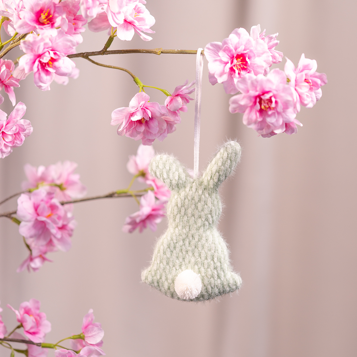 - Hang de konijntjes aan een decoratieve paastak met bloeiende twijgen.