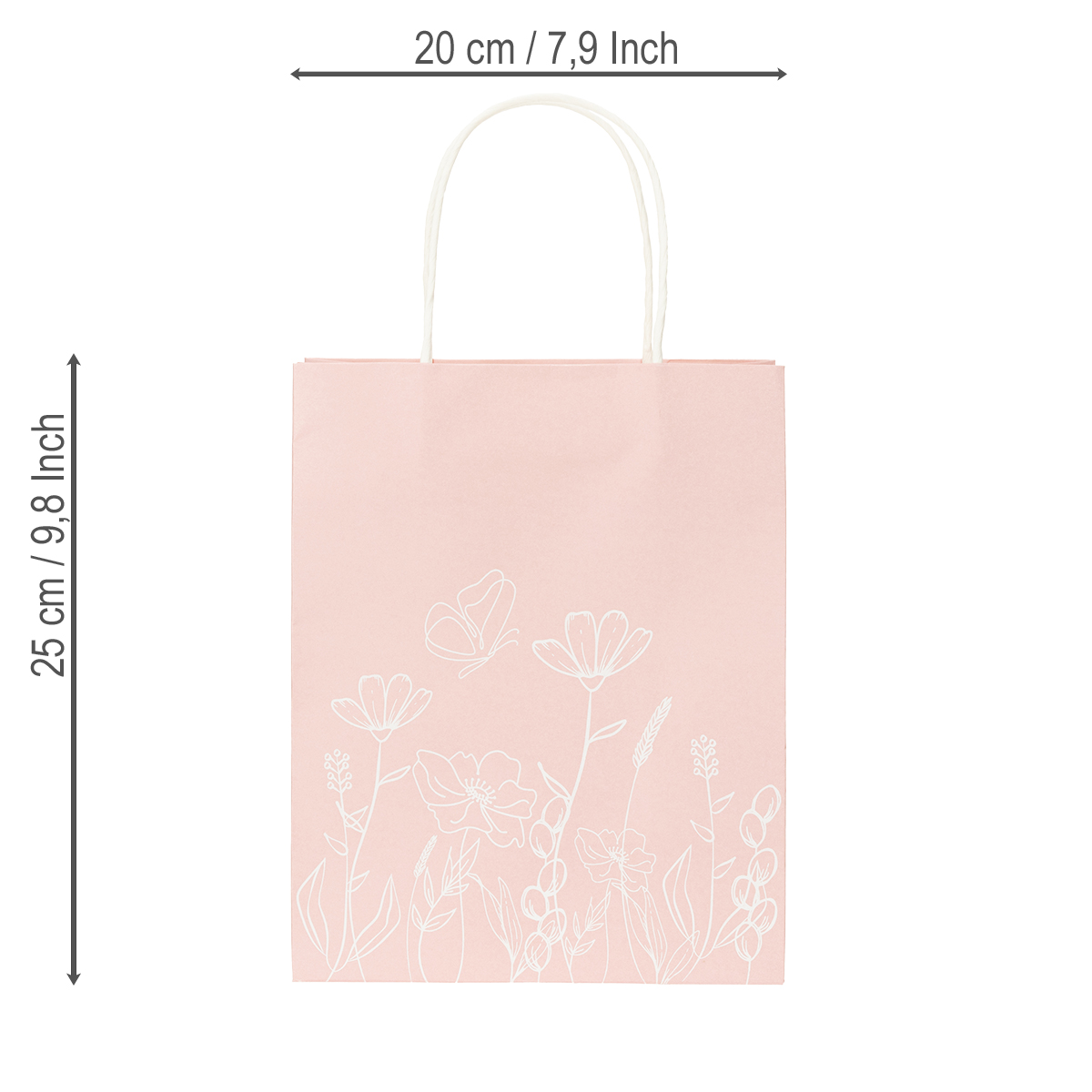 Het subtiel op de tassen gedrukte bloemenpatroon is bijzonder opvallend. Het geeft de tassen een vleugje elegantie en frisheid – perfect voor lentefeesten, zomerverjaardagen of romantische gelegenheden. Ook wie waarde hecht aan duurzaamheid zal onder de indruk zijn: de tassen zijn gemaakt van papier, waardoor ze een milieuvriendelijk alternatief zijn voor plastic verpakkingen. De praktische draaghendels maken ze gemakkelijk in gebruik en zorgen voor stijlvol transport van de verpakte verrassing.