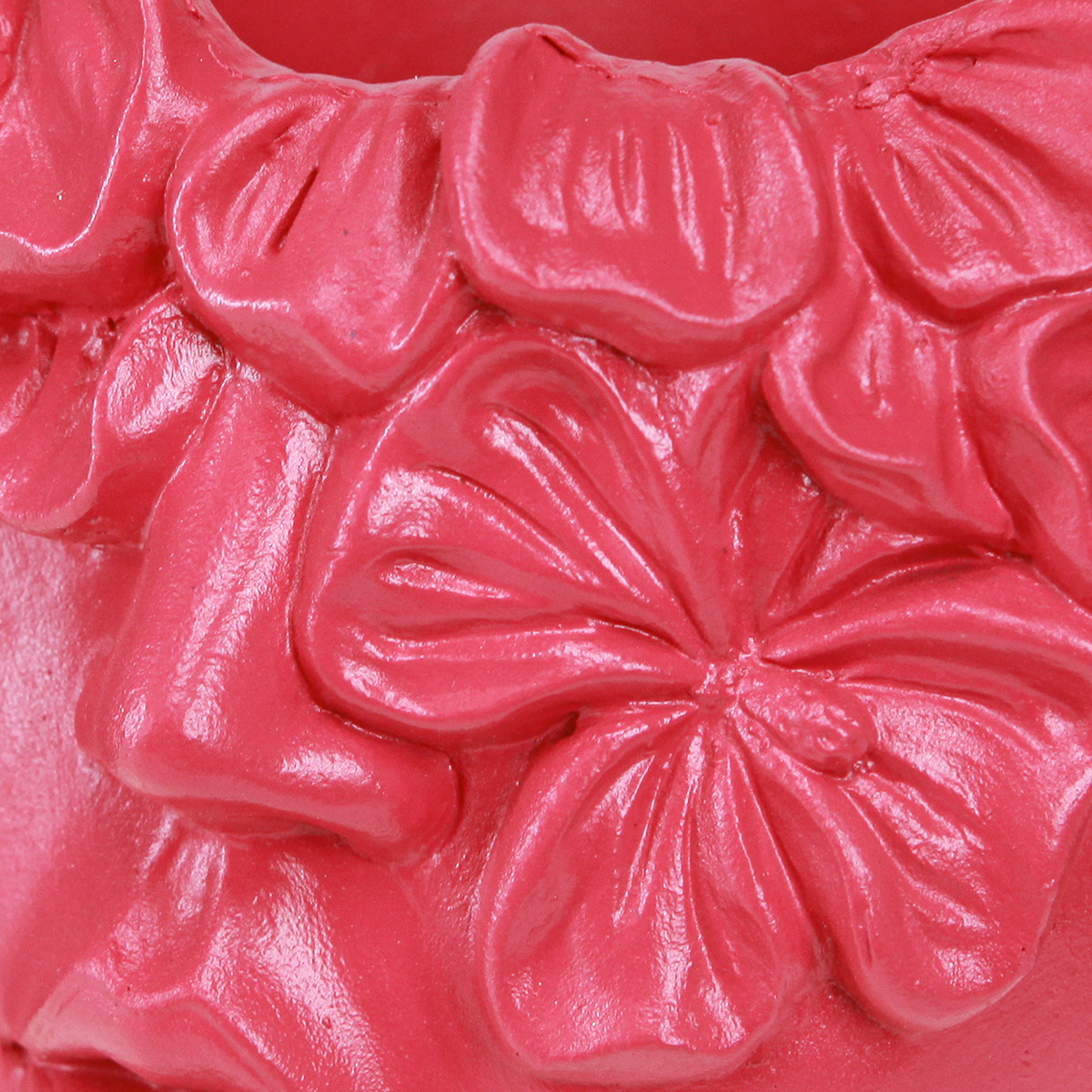 In de taal van bloemen staat de felle roze kleur van de plantenkop voor speelsheid, jeugdigheid en energie. Deze tint brengt levendigheid in elke kamer en kan vreugde en creativiteit bevorderen. Het materiaal polyresin geeft de plantenbak een duurzame en onderhoudsvriendelijke textuur, wat ideaal is voor decorateurs en hobbyisten die op zoek zijn naar een flexibele maar toch duurzame decoratie. Roze kan gecombineerd worden met zachte pasteltinten of contrasterende kleuren zoals groen of wit om de gewenste sfeer te benadrukken.