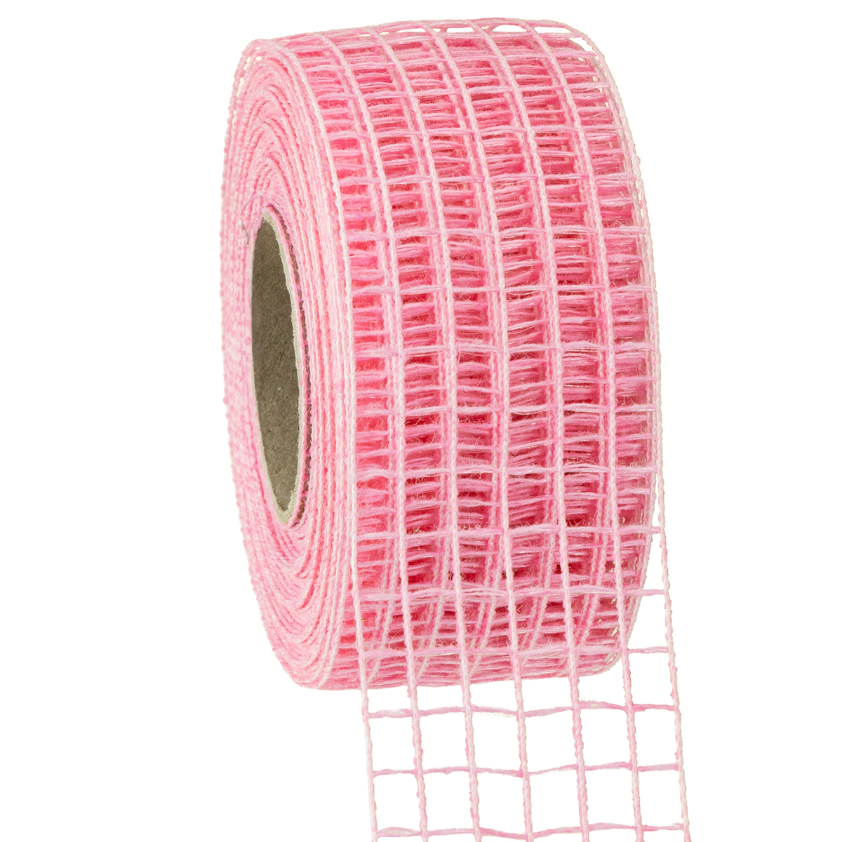 Het roze gaas is tot een rol gewikkeld en heeft een lengte van ongeveer 10 meter en een breedte van ongeveer 4,5 centimeter.