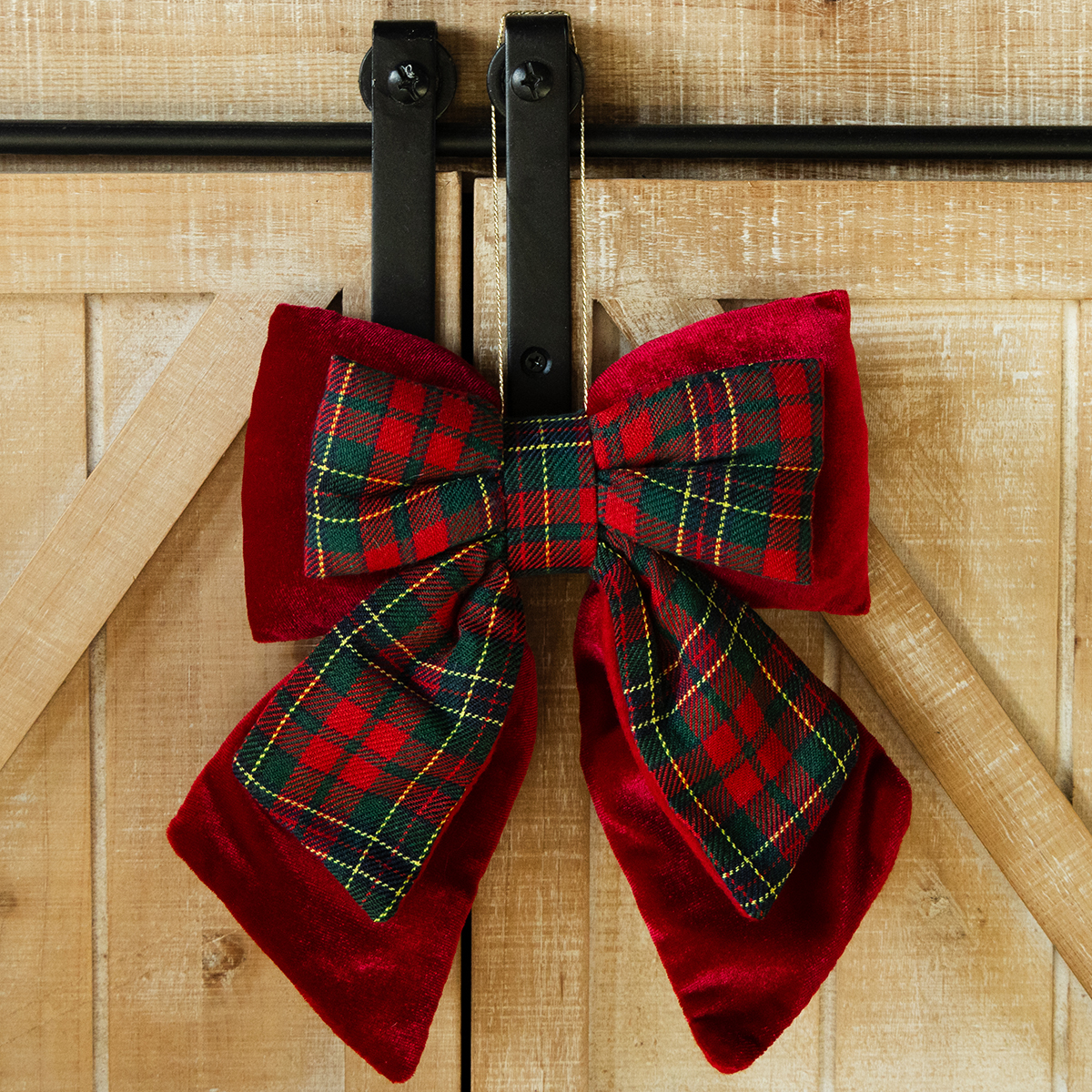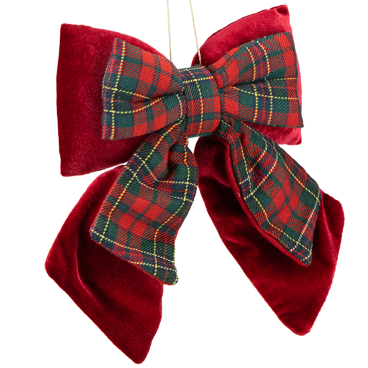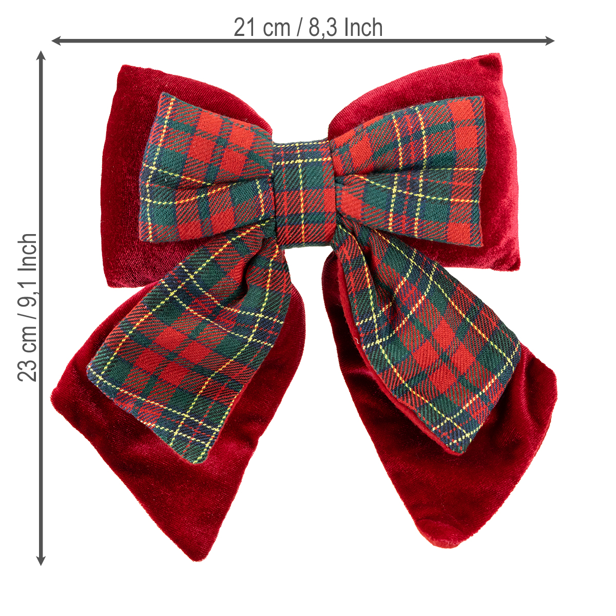 De rode fluwelen strik en de iets kleinere decoratieve strik met Schots ruitpatroon combineren esthetiek en functionaliteit. De levendige fluwelen stof combineert met het tijdloze ruitpatroon en biedt het contrast van klassieke kerstkleuren en harmonie in één. Met een afmeting van ongeveer 21 x 23 cm is hij niet te groot en niet te klein, precies de juiste maat voor een stijlvol accent. De gevulde binnenkant van de strik zorgt ervoor dat hij goed blijft zitten – of je hem nu aan een krans bevestigt, als deurdecoratie gebruikt of ermee muren en ramen decoreert.