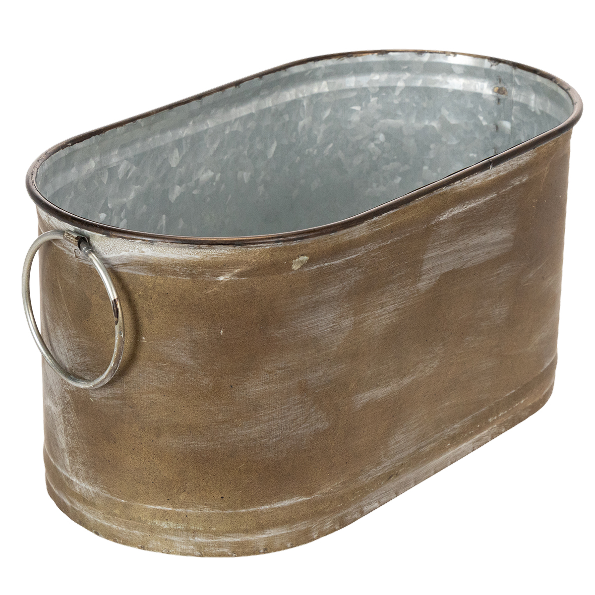 De cachepots in de set van 3 hebben de vorm van kleine kuipjes. De buitenkant van de metalen kuipen is koperwit gewassen. De kleur en vorm zijn retro van stijl, waardoor ze geschikt zijn voor een vintage tafelsetting. Het retro karakter wordt onderstreept door de grote beweegbare ringen die als handvatten fungeren.