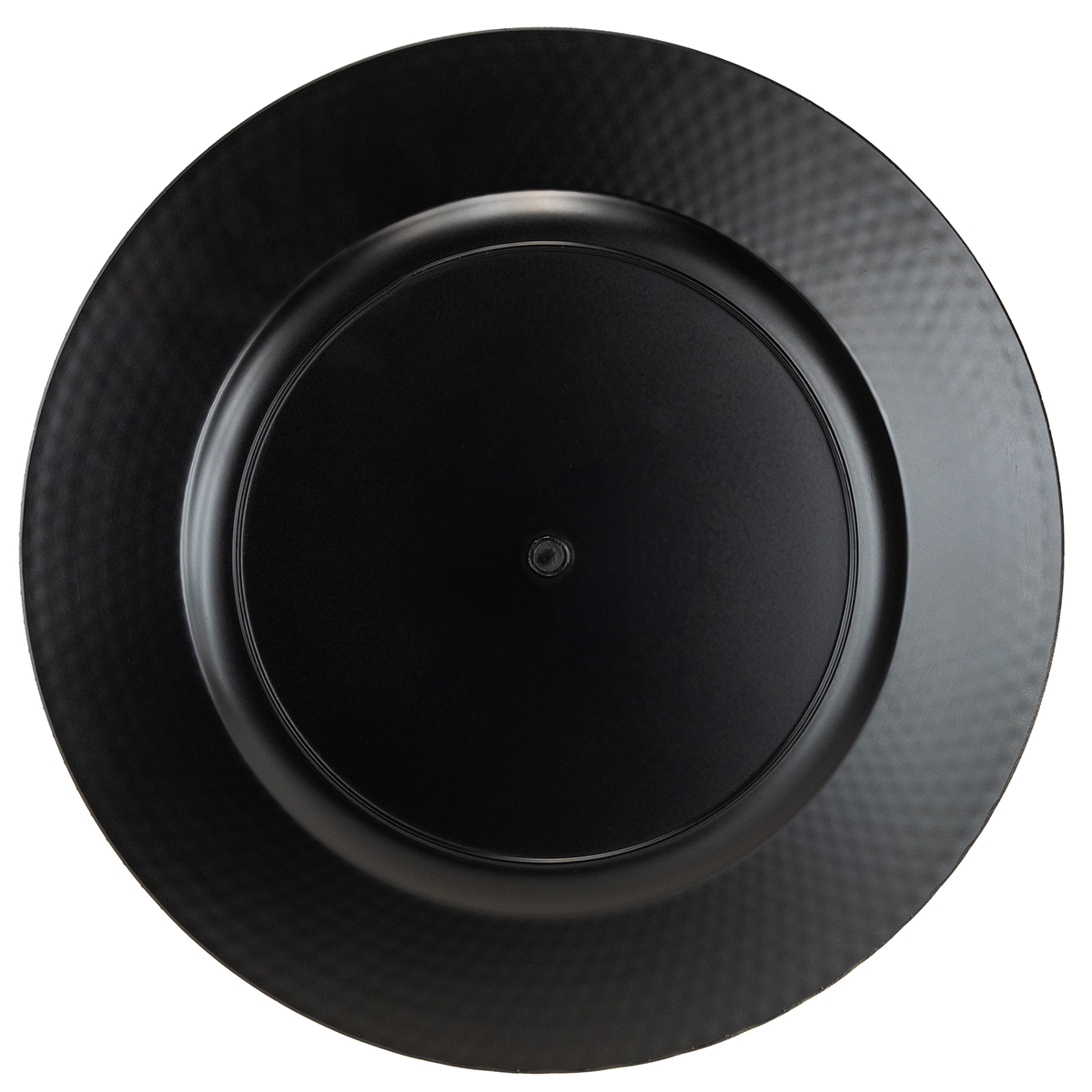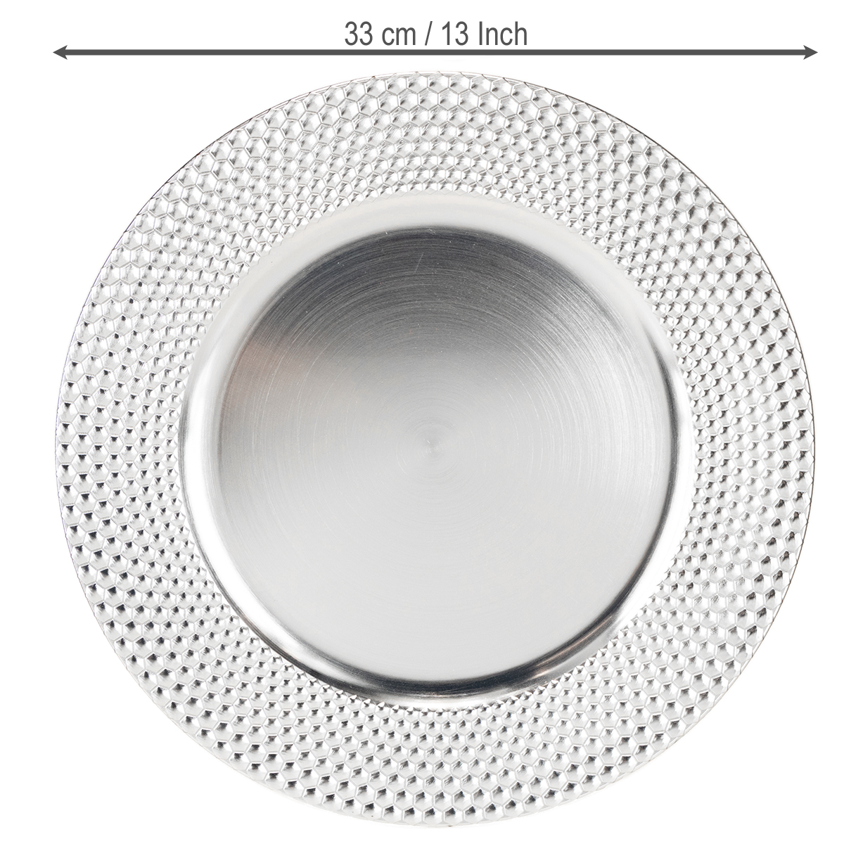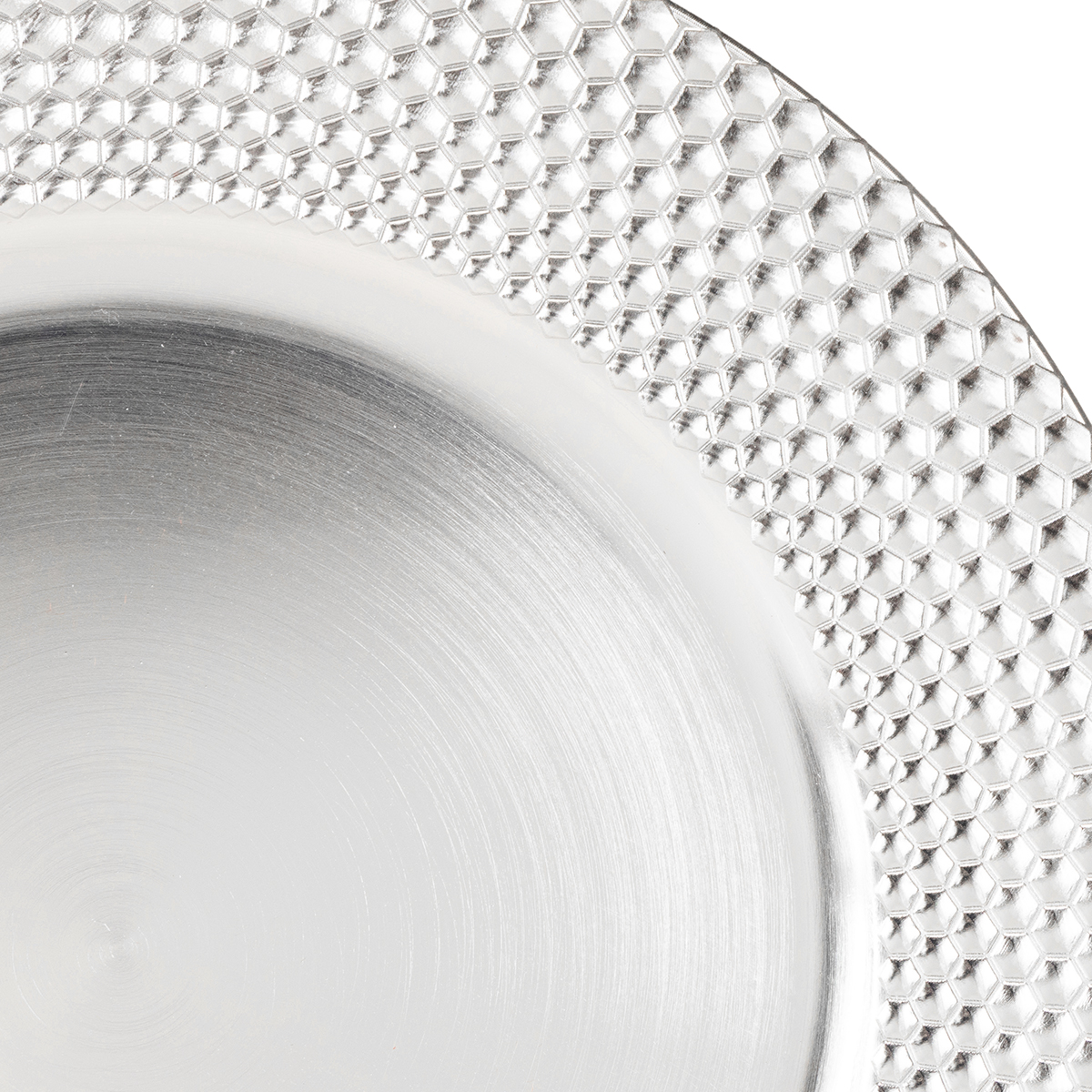 Maar het is het zeshoekpatroon op de rand dat het bord tot een blikvanger maakt. De zilveren kleur geeft het sierbord een geweldige uitstraling. De onderkant blijft onbehandeld in het zwart.
