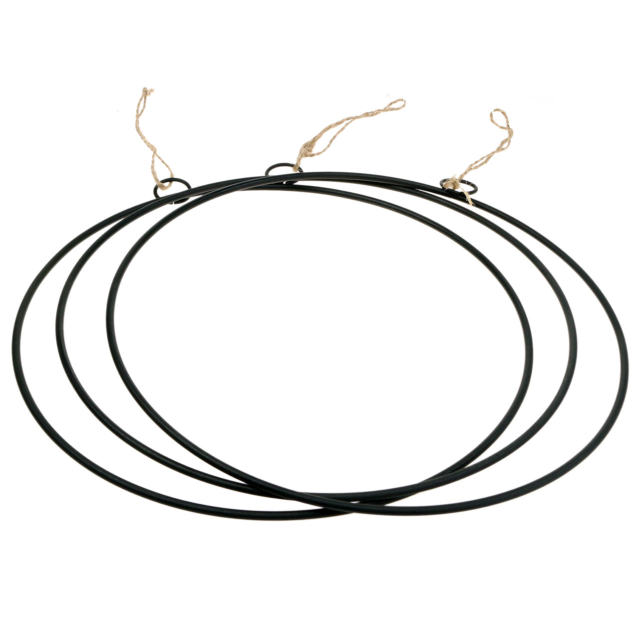 De grote decoratieve ring in zwart is gemaakt van metaal en heeft een geschatte diameter van 50 centimeter en een dikte van ongeveer 4 millimeter. De kamerdecoratie hang je eenvoudig aan het oogje of het jutelint. Je krijgt er in totaal drie.