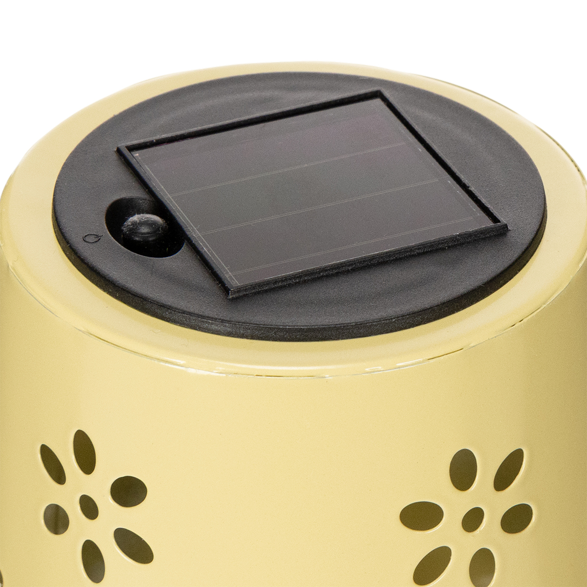 Deze op zonne-energie werkende tafellamp is meer dan zomaar een lamp – het is een echte blikvanger. Het delicate, opengewerkte bloemenpatroon zorgt voor speelse licht- en schaduweffecten en transformeert elke buitenruimte in een oase van rust. Met een hoogte van 28 cm en een diameter van 11 cm past de lamp harmonieus op zowel kleine balkons als grote terrassen. Het materiaal is al even indrukwekkend: robuust metaal in een zachtgele tint geeft de lamp een vrolijke en moderne uitstraling.