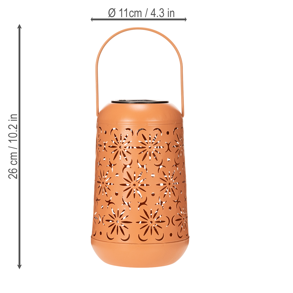 Met zijn warme licht en bloemenpatroon creëert deze solarlantaarn een uitnodigende sfeer in elke buitenruimte. De delicate bloemmotieven geven de tuin een vleugje elegantie en een subtiele boho-uitstraling. Het hoogwaardige vakmanschap in een zachte oranje tint harmonieert perfect met zowel moderne als klassieke tuinstijlen. Of u nu romantische lichtaccenten wilt creëren op zwoele zomeravonden, uw terras stijlvol wilt verlichten of op zoek bent naar een decoratieve oplossing voor een tuinfeest – deze solarlantaarn voor buiten is meer dan alleen een lichtbron. Het is een blikvanger in elke buitenruimte.