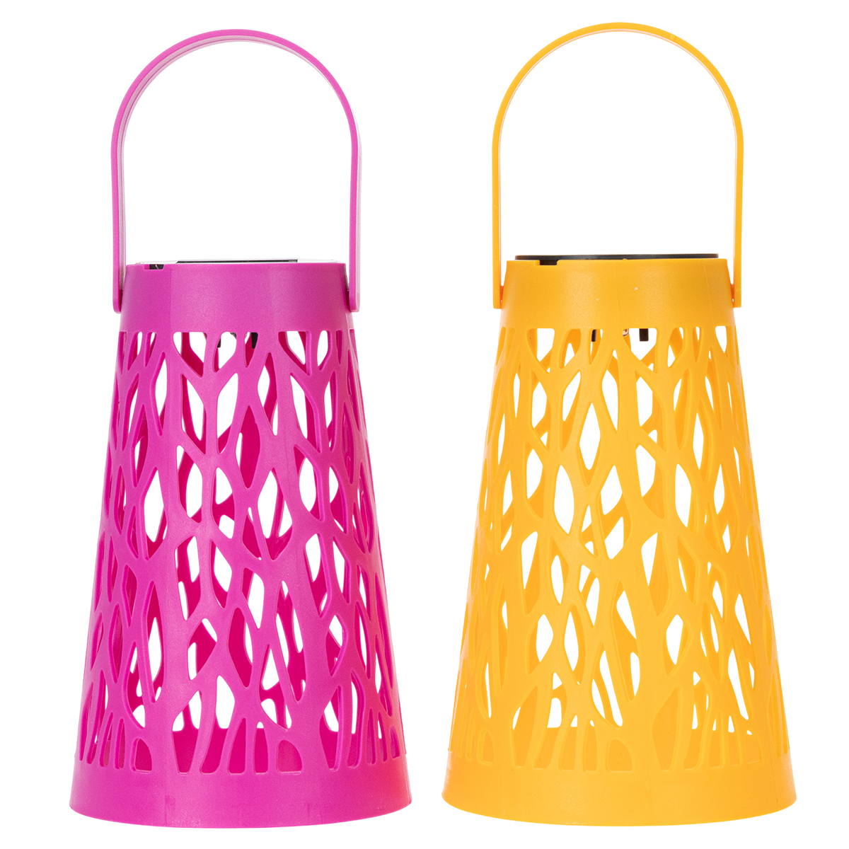 Deze set van twee lantaarns – een in vrolijk roze en de andere in levendig geel – fleurt uw buitenruimte op. De moderne uitstraling van deze LED-lantaarns, gemaakt van verfijnd, geperforeerd plastic, past perfect bij een zomerse sfeer en integreert naadloos met vrijwel elke tuinstijl. Het warmwitte licht van de LED's zorgt voor een zachte, uitnodigende gloed zonder verblinding, waardoor deze lantaarns een veelzijdige en geliefde toevoeging aan uw buiteninrichting zijn. Ontdek hoe gemakkelijk het is om uw tuin te laten stralen!