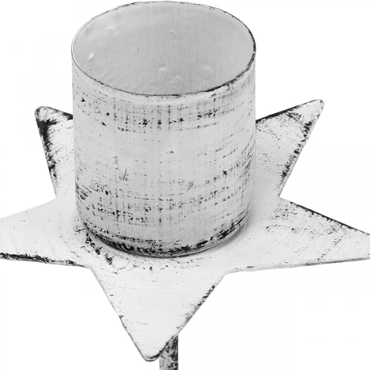 De witte metalen kaarsenhouder heeft een trendy shabby chic design en past perfect bij natuurlijke, landelijke kerstversieringen. Dankzij de lange houder met spikes is de kaarsenhouder gemakkelijk in steekschuim of strokransen te plaatsen. De kaarsenhouder kan ook in met aarde of decoratief zand gevulde potten worden geplaatst, waardoor een ster ontstaat.