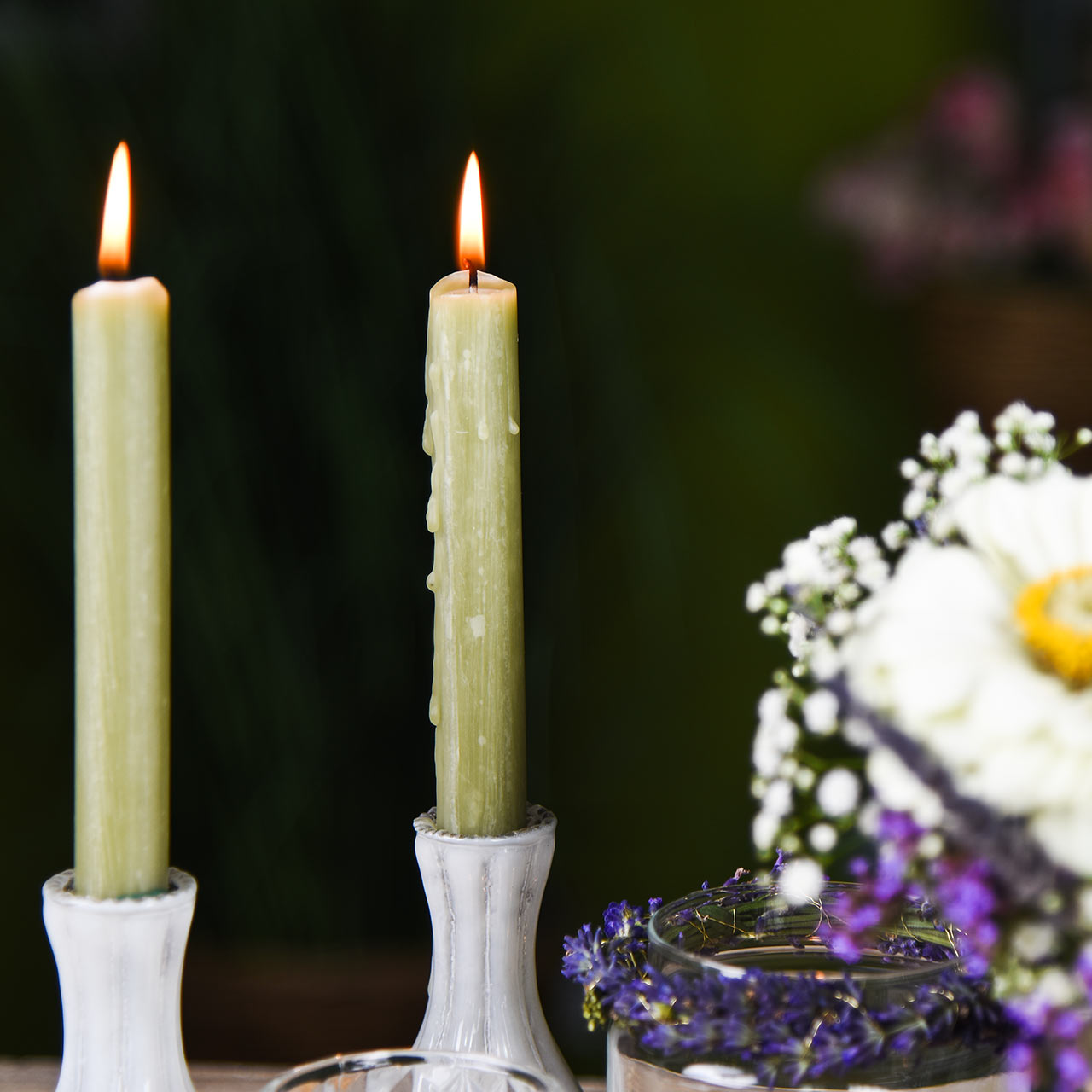 Voor kleinere decoraties of als je op zoek bent naar kaarsdecoraties met verschillende hoogtes, er is ook een kleinere versie van de groene taper kaarsen in onze winkel.
